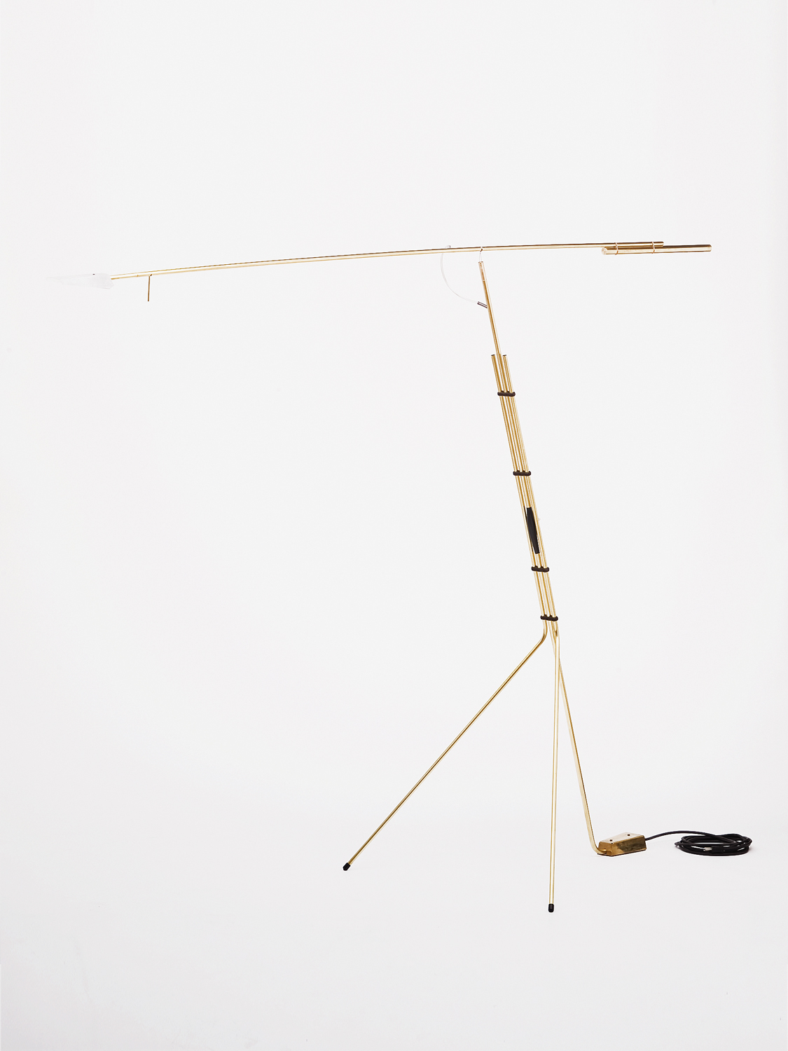 Die 'Stehleuchte' besteht aus Messingrohren. Drei Rohre dienen als Fuss und lenken oben über zur Querstange, an der das Leuchtmittel befestigt ist. Von der Seite wirkt die Leuchte wie ein schiefes T. Das Leuchtmittel lässt sich um seine Achse drehen. Ein- und ausgeschaltet wird das Licht mit einem Kippschalter am Dreibein.