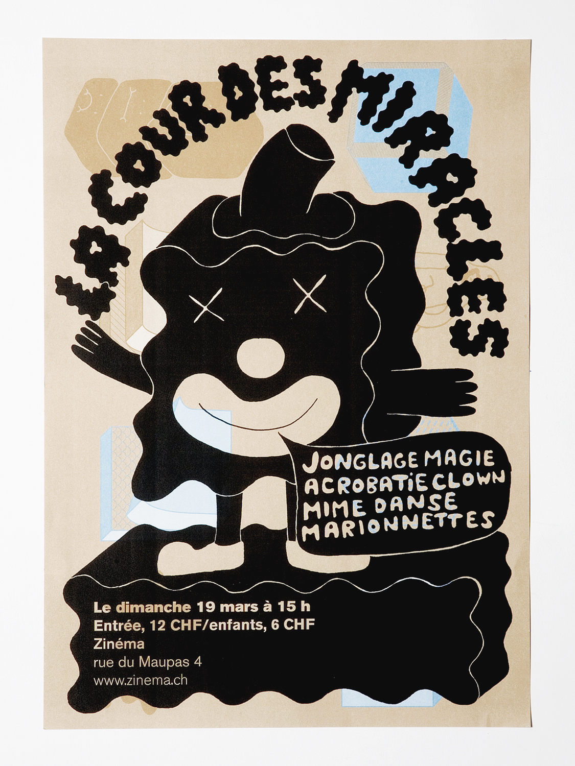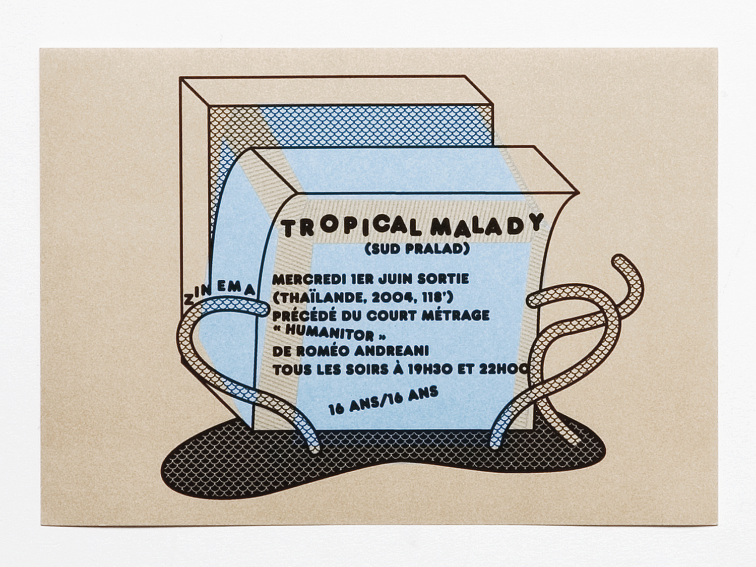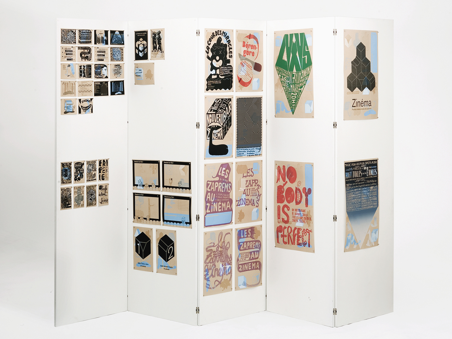Für den kleinen, alternativen Kulturort 'Zinéma' in Lausanne haben Tatiana Rihs und Guy Meldem das grafische Erscheinungsbild entworfen. Ihre Aufgabe war es, ein System für Drucksachen zu entwerfen, das man schnell und günstig bespielen kann. Die beiden Grafiker schlagen dafür einen grossen bedruckten Bogen vor, den der Veranstalter im DIN A Raster von A6 bis A1 verwenden kann, indem er ihn auf die gewünschte Grösse schneidet und bedruckt. Der Bogen besteht aus braunem Papier und ist mit beigen, hellblauen und weissen Illustrationen versehen, die sich vom bestehenden Logo ableiten. Es sind Kuben, die schmelzen und sich verwandeln und so auch auf die Vielfalt der Kulturinstitution hindeuten. Schneidet man den Bogen in die verschiedenen DIN A Grössen, bleiben die Illustrationen immer mittig platziert. Auf diesen Hintergrund gestalten die Grafiker Plakate, Flyer und andere Drucksachen. Das können je nach Veranstaltung 400 Flyers oder nur wenige Plakate sein. Je nach Wichtigkeit des Anlasses wird der neue Inhalt kopiert oder mittels Laser- oder Siebdruck darauf gedruckt. Dies erlaubt dem Veranstalter schnell und günstig zu handeln und abgesehen von einer Anfangsinvestition von 3000 DIN A1 Bögen halten sich seine Ausgaben in Grenzen. Das Design kann bewusst Bezug zum Hintergrund nehmen und so entsteht ein Dialog zwischen Hintergrund und Veranstaltungsinfo. So verkündet zum Beispiel eine aufgedruckte Sprechblase, die zu einer Figur des Hintergrunds führt, eine Veranstaltung oder ein sich öffnender Würfel ist auf einen anderen geschlossenen Würfel des Hintergrunds gedruckt. Ein Design kann aber auch auf alle Teile des Bogens gedruckt werden und so entstehen dank dem vielfältigen Hintergrund verschiedene Variationen des gleichen Veranstaltungsflyers. Inhaltlich leiten die Grafiker das Motiv entweder von der Veranstaltung oder vom Logo oder von beidem ab. Die Gestaltung von Tatiana Rihs und Guy Meldem ist illustrativ und direkt. Dies gibt dem Erscheinungsbild trotz der Vielfalt eine lebhafte und wiedererkennbare Handschrift. Die Gestaltung passt zum Ort und zur Szene.