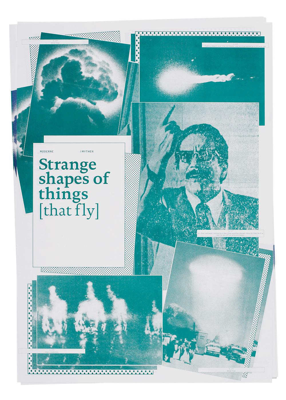 Unter dem Titel 'Strange shapes of things [that fly]' präsentiert Katja Naima Schalcher ihre Diplomarbeit in Form von zwei gebundenen Publikationen, die im Jahre 2007 an der Zürcher Hochschule der Kunst (ZHdK) entstanden sind. Im Mittelpunkt der sehr aufwändig gestalteten Arbeit stehen moderne Mythen und Verschwörungstheorien. Exemplarisch wird deren Erscheinungsformen und Wesensarten anhand des Ufo-Mythos nachgegangen. Das sorgfältig zusammengetragene Archiv über unbekannte Flugobjekte der Baslerin Lou Zinsstag ist der Ausgangspunkt der Recherche. Augenzeugenberichte, Zeitungsartikel und Abbildungen belegen die zahlreichen Geschichten der unheimlichen Sichtungen seit den 40er Jahren. Dokumentiert sind Objekte von der klassischen Untertasse über unerklärliche Leuchtkugelkonstellationen bis hin zur fliegenden Kartoffel.