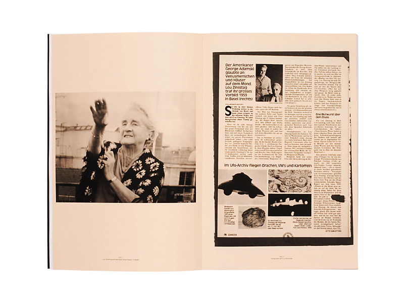 Katja Naima Schalcher ist es sehr gut gelungen, ein vorhandenes Archiv zu visualisieren, das Thema mit aktuellen Reflektionen und Informationen zu ergänzen und Teile des Archivs in neuer, konzentrierter Ordnung zu präsentieren. Die Publikation weiss mit sehr abwechslungsreich gestalteten Seiten zu packen, auf denen es allerlei ausserirdische Kuriositäten zu entdecken gibt. Mit den im Verlauf der Publikation immer mehr aufgeblasenen Ufobildern wird der typische Entwicklungsprozess moderner Mythen visualisiert. Analog dazu nimmt die beklemmende Verschwörungsthematik von Seite zu Seite mehr Raum ein und zieht den Leser unausweichlich in seinen Bann.