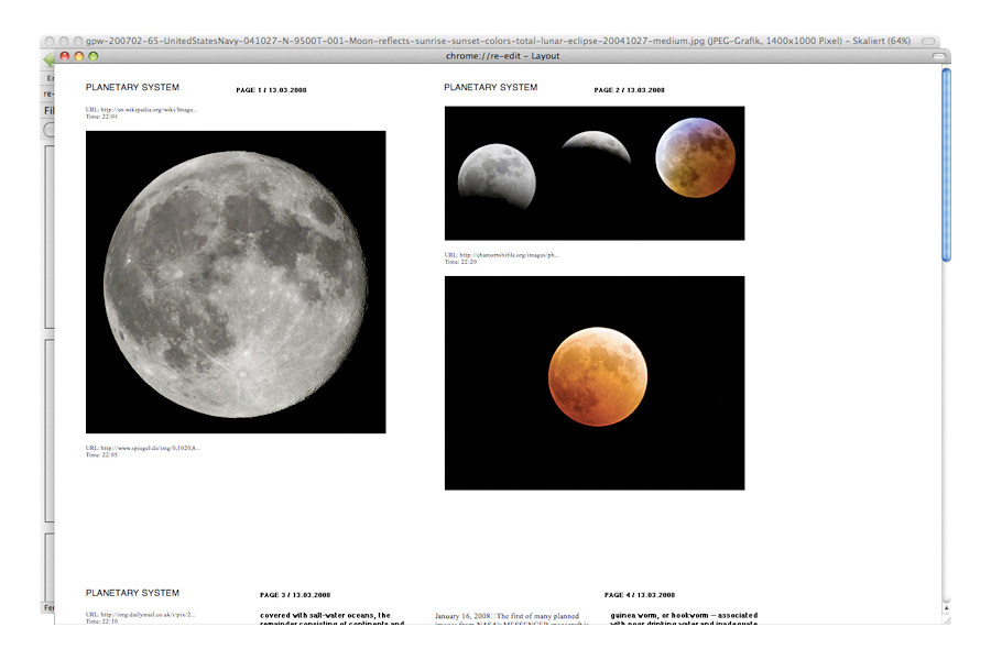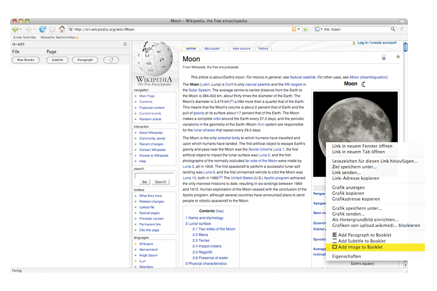 Wer hat nicht genug von den reisserischen Artikeln der Gratiszeitungen, die in 20 Minuten die Welt rekonstruieren? Mit der Internetanwendung von Lukas Zimmer kann der Leser seine Lesegewohnheiten aktiv verändern. Damit entscheidet er selber, was als allmorgendliche Lektüre schwarz auf weiss auf den Tisch kommt. Der junge Grafiker aus Zürich erforscht die Möglichkeiten des neuen Lesens im Internet. Ihn interessiert die Frage, wie sich die Rolle des Autors und des Lesers in einer Zeit verändern, in der sich anstelle des linearen Lesens zunehmend ein fragmentiertes Lesen manifestiert. Zusammen mit einem Programmierer entwickelt er eine frei zugängliche Firefox Browser Extension, die es jedem Internetbenutzer erlaubt, mit wenigen Mausklicken die eigenen Recherchen zu einer handlichen Broschüre zusammenzustellen und auf Papier auszudrucken. Die gefundenen Text- und Bildbausteine werden einfach auf eine übersichtlich gestaltete Arbeitsoberfläche gezogen, in ein bis drei Spalten eingesetzt, mit eigenen Worten ergänzt und in einem persönlichen Layout editiert. Durch die handliche Internetanwendung werden die kaum nachvollziehbaren und meist flüchtigen Kopfreisen von einem Link zum nächsten ohne grossen Aufwand greifbar. Noch vor dem ersten Kaffee, kann so ein beliebiges Thema unkompliziert dokumentiert, in der eigenen Formensprache ergänzt und für eine gebündelte Re-Lektüre verfügbar gemacht werden. 'Re-edit' (Arbeitstitel) ist ein handliches Hilfsmittel für die effiziente Informationssuche im Netz, welches im Moment zwar noch nicht online verfügbar ist, aber hoffentlich in naher Zukunft auf die Struktur des Internets mit ihren Besonderheiten eingeht und in Bezug auf die veränderten Lesegewohnheiten ein brauchbares Mittel darstellt. Mit 'Re-edit' wird loses Wissen visualisiert und handhabbar gemacht: Nicht nur für Leute, die von 'Cut, Copy and Paste' keine Ahnung haben.