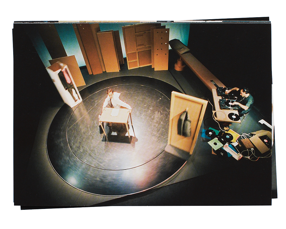 Das aktuelle Theaterstück 'Gaff Aff' spielt auf einer kleinen Bühne in Form eines überdimensionierten Plattenspielers. Auf dem sich fortlaufend drehenden schwarzen Teller imitiert die Figur (Martin Zimmermann), die fein säuberlich im Anzug und mit Aktenkoffer unterwegs ist, pantomimisch die Irrungen und Wirrungen des modernen Lebens. Aus der Kulisse, einem mit Konsumgeräten bedruckten Verpackungskarton, zaubert sie im Verlaufe des Stücks allerlei hervor: Einen Stuhl zum Falten, dazu einen Tisch, eine Lampe, einen Kleiderbügel. Es entsteht ein kleiner, intimer Wohnraum. Die sich teils wild zum Rhythmus der Musik bewegende und zwischen Handy und TV zappelnde Figur scheint mal dem Wahnsinn nahe, mal völlig ruhig gestellt.