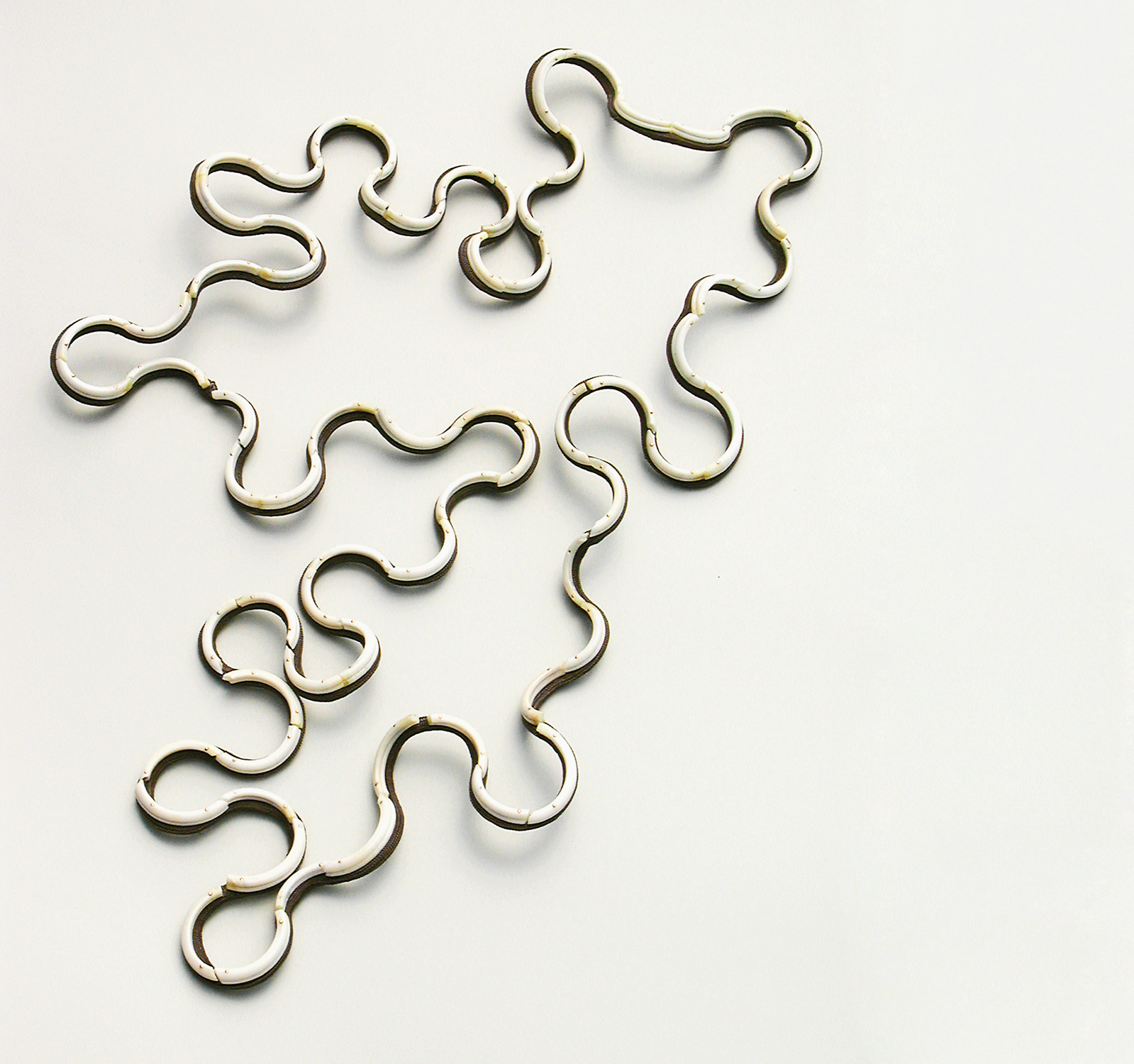 Bereits in ihrer Diplomarbeit befasste sich Natalie Luder mit den Bräuchen barocker Festmahle, die auch für die beiden prämierten Projekte zum Ausgangspunkt wurden. Rund um 'Das Jagdessen' hat die Schmuckdesignerin eine Welt aufgebaut, die sich um das wesentliche Material der Kollektion dreht: Hasenzähne. Mit scheinbar unendlicher Geduld hat die Künstlerin das 'Elfenbein' für das Herzstück der Kollektion, die Kette '125 Lapins', aneinander gereiht. Natalie Luder wollte ihre Arbeiten aber nicht in einer Vitrine ausstellen, sondern organisierte ein Festmahl, an dem der Schmuck von den Gastgebern wie Trophäen getragen wurden und die Gäste so Gelegenheit hatten, die Kostbarkeiten aus nächster Nähe zu betrachten. Grundlage für das Menu waren die 125 Kaninchen, die für die Schmuckproduktion ihre Zähne respektive ihr Leben lassen mussten. In Anlehnung an die ausgedehnten und üppigen Tafelrunden des Barockzeitalters wurden für die zahlreichen Kaninchen verschiedene Hasenrezepte gesucht und von 15 Köchen zubereitet. Eine Kamera hielt das einmalige Festmahl für die Nachwelt in Form eines Kurzfilms fest. Gut so, denn die Vorbereitung und Organisation des Jagdessens dauerte ganze drei Jahre. Natalie Luder lotet gerne Grenzen aus, die den Betrachter auch herausfordern. So anmutig schön ihre Schmuckstücke sind, so irritierend ist das eigenwillige Material.