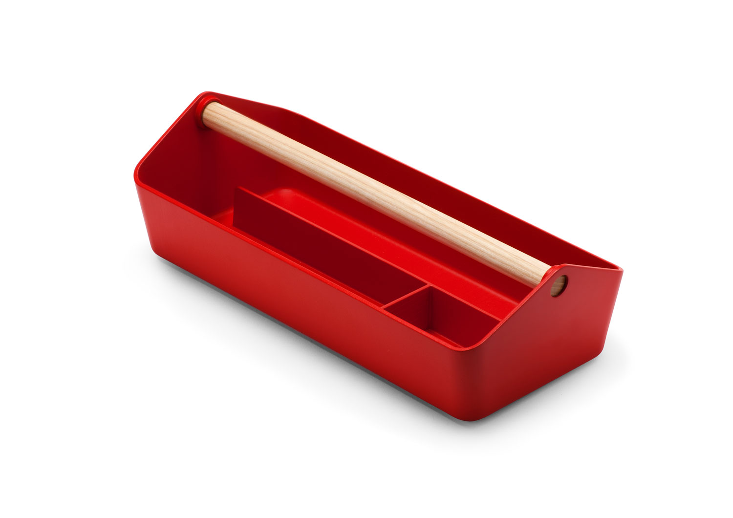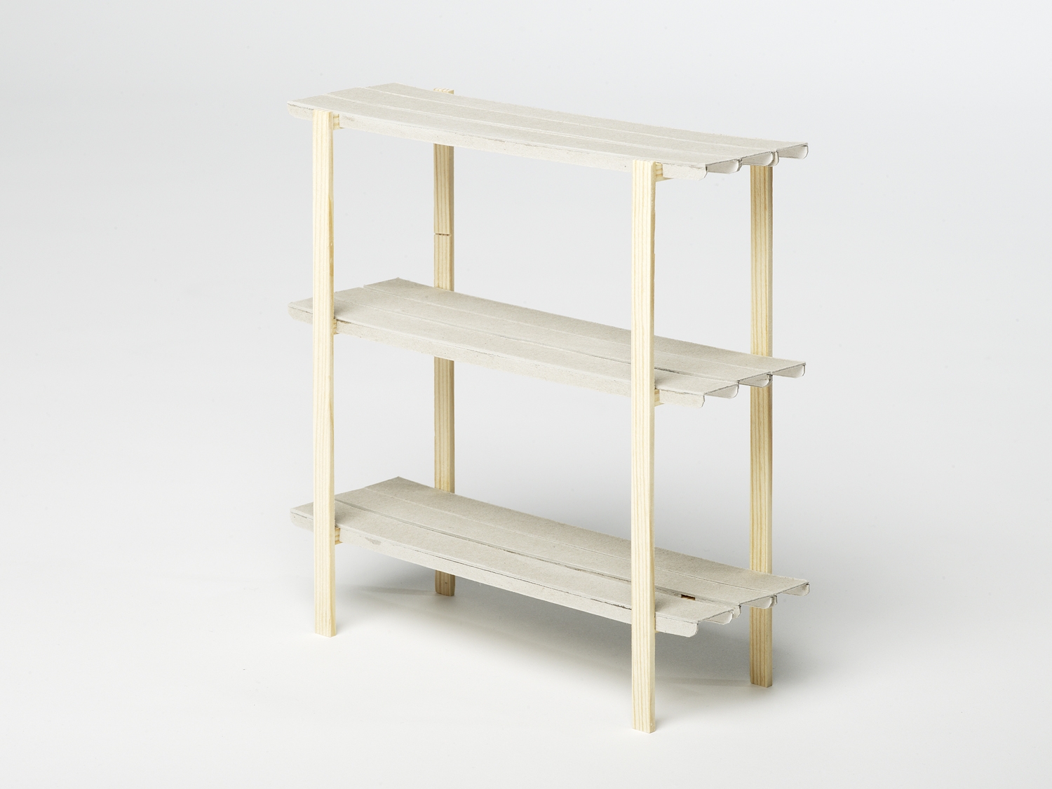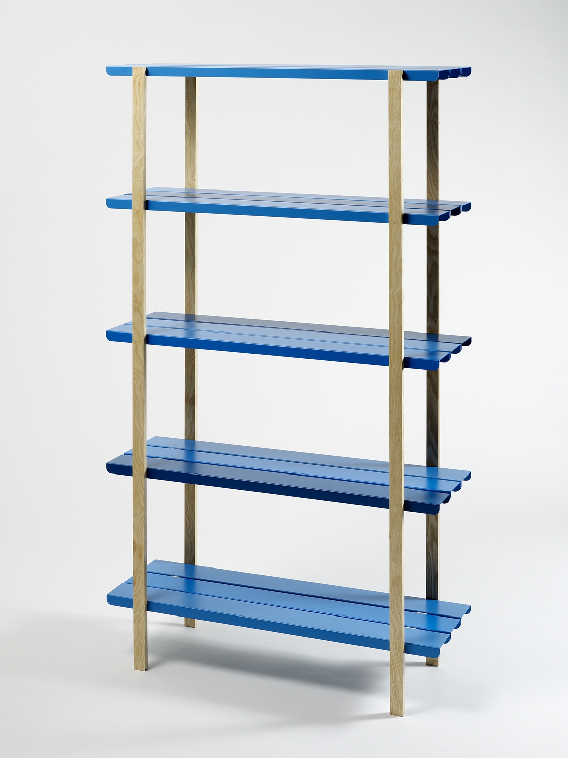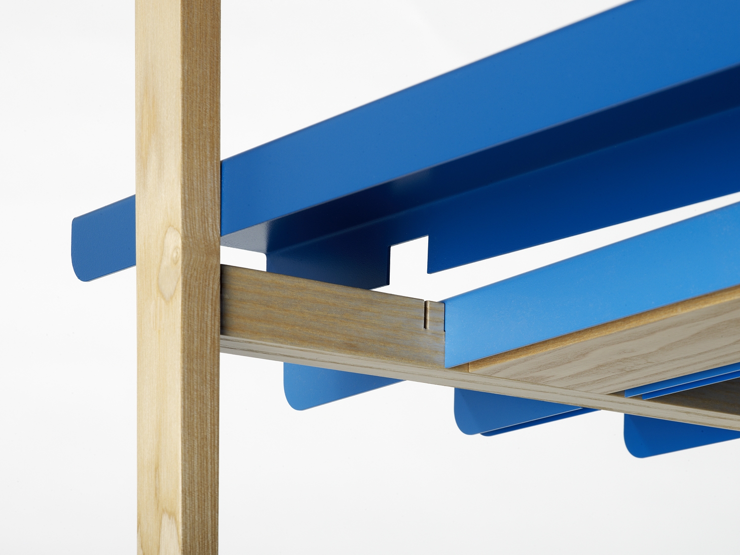 Zwei Holzträger aus Eschenholz, neun farbig gespritzte Alu-Kufen: In verblüffend einfacher Weise kann selbst ein Handwerksamateur die einzelnen Elemente des Regalsystems 'FLOORS' zusammenstecken und vielseitig – in Höhe und Breite variabel – zusammenbauen. Binnen Minuten entsteht so ein leichtes Gestell in archetypischer Form, ohne eine einzige Schraube anbringen zu müssen.