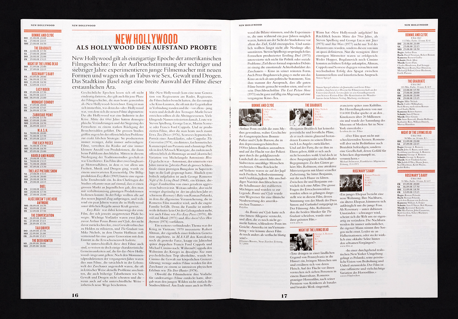Jeder Basler kennt sie, die Plakate und die Programmzeitschrift von Ludovic Balland. Seit 2007 zieren sie die Litfasssäulen im Basler Stadtbild und liegen in zahlreichen Cafés und Kinos auf. Monat für Monat kündigt ein neues Plakat, gestaltet nach dem immer gleichen Prinzip, dem Betrachter/Besucher zwei neue thematische Kult-Filmreihen des Stadtkinos an: Elemente wie schwarzweisse Filmstills und Schlagzeilen aus Zeitungen der 50-Jahre werden zusammen mit einer augenfälligen Gestaltung der Typografie zu einer ästhetischen Einheit verbunden und laden ein, in die Welt des Films zu tauchen. In demselben Stil ist auch die Programmzeitschrift gestaltet. Bei dieser stellt der praktische Abreisskalender, der sich in jede Handtasche stecken lässt, eine Besonderheit dar. Mit der Kombination von zwei altbewährten Medien vermag Ludovic Balland durch qualitativ hochstehende Arbeit und eine eigenständige Ästhetik für die Filmklassiker zu werben, die von François Truffaut über Lucchino Visconti bis Jim Jarmusch reichen.