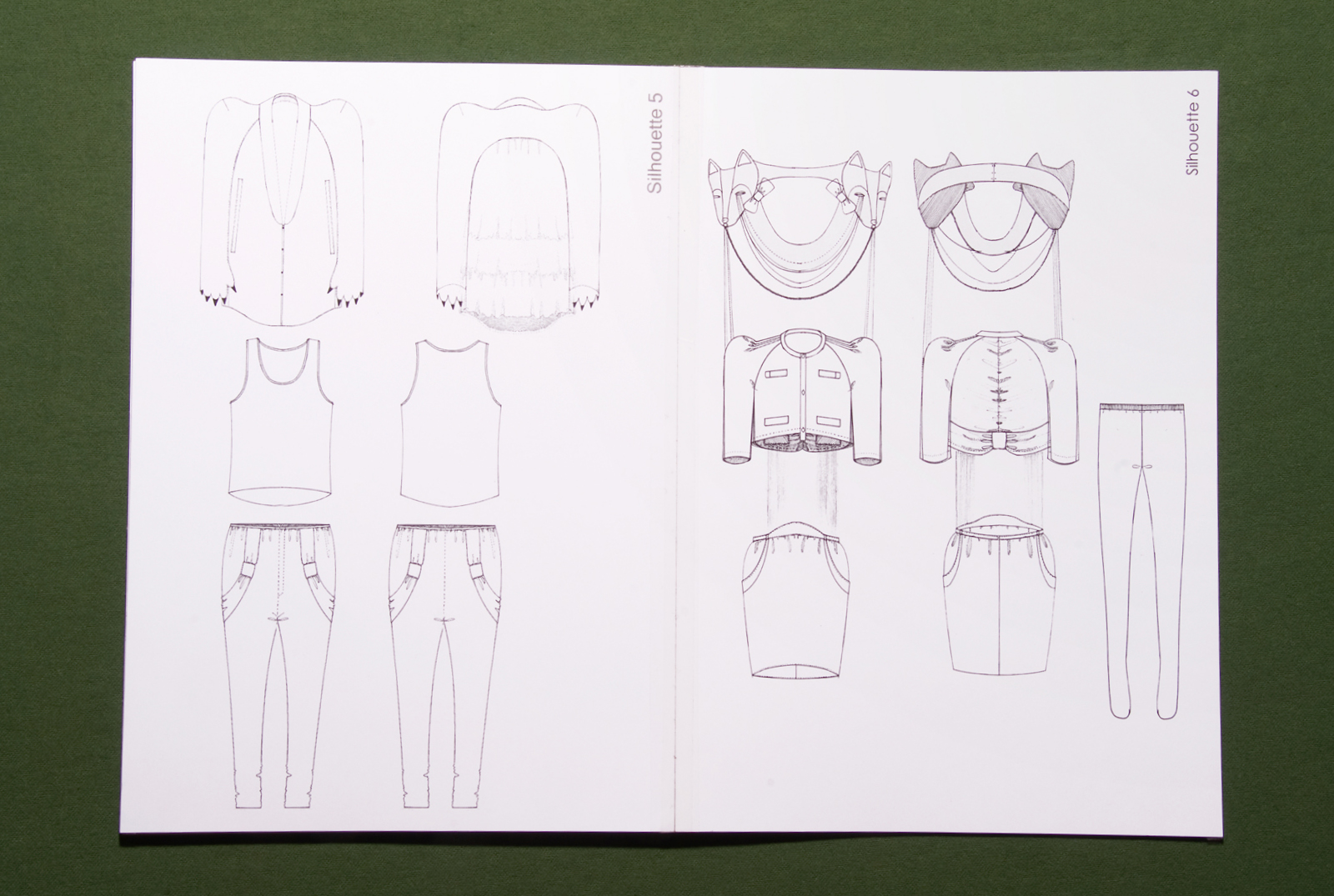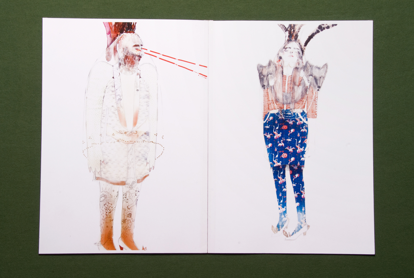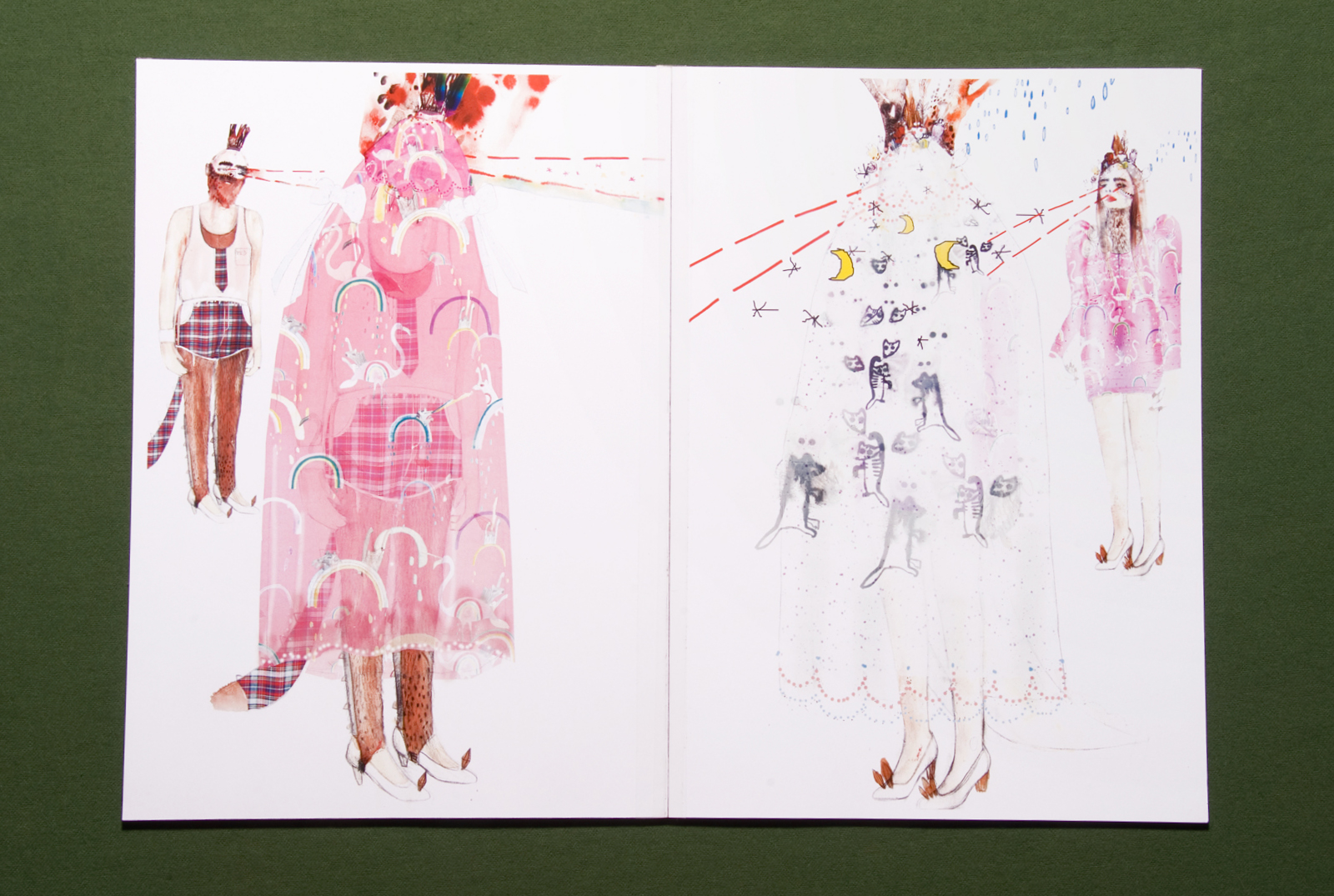 Um die vielen Eindrücke dieser Wunderkisten ordnen zu können ist es hilfreich, das Arbeitsbuch von der jungen Modedesignerin zur Hand zu nehmen. Darin finden sich in reichen und fantasievollen Illustrationen die Herleitung zur Geschichte hinter der Kollektion. Sie handelt von Liebespaaren, die aus Las Vegas in die tiefsten Tiefen des Waldes flüchten. Dort, im Zauberwald, übernehmen Tiere das Zepter: 'Die Krallen zeigen sich, der Pelz ragt aus der leichten Seidenbluse hervor, die Erde und die Prismen verschlingen Hosensäume, eine Rückenflosse bildet sich heraus...'. Die Frauen und Männer (die Outfits sind paarweise zu verstehen) wandern in langen Schleiern durch den Wald und sammeln Objekte, die sie sich auf ihre Kronen stecken. Mit Laserstrahlen, die aus ihren Augen strahlen, blicken sie sich gegenseitig innig an und sagen 'Ich liebe Dich'.