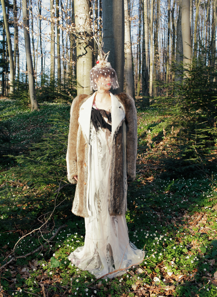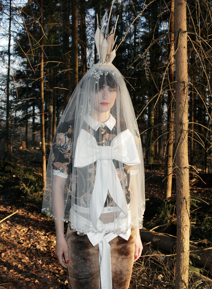 Mariel Manuel präsentierte ihre achtteilige Kollektion in sargartigen Holzkisten. Die Outfits lagen schön drapiert in den verschlossenen Kisten und beim Öffnen eröffnete sich ein Wunderland: Bärentatzen, Holzscheite mit Perlenkette, Fuchsköpfe und -schwänze, wunderschöne Farbprints auf feinen Stoffen und Strümpfen, weisse und rosafarbene Brautschleier, reichverzierte Krönchen, aberwitzige Schuhe und vieles mehr.