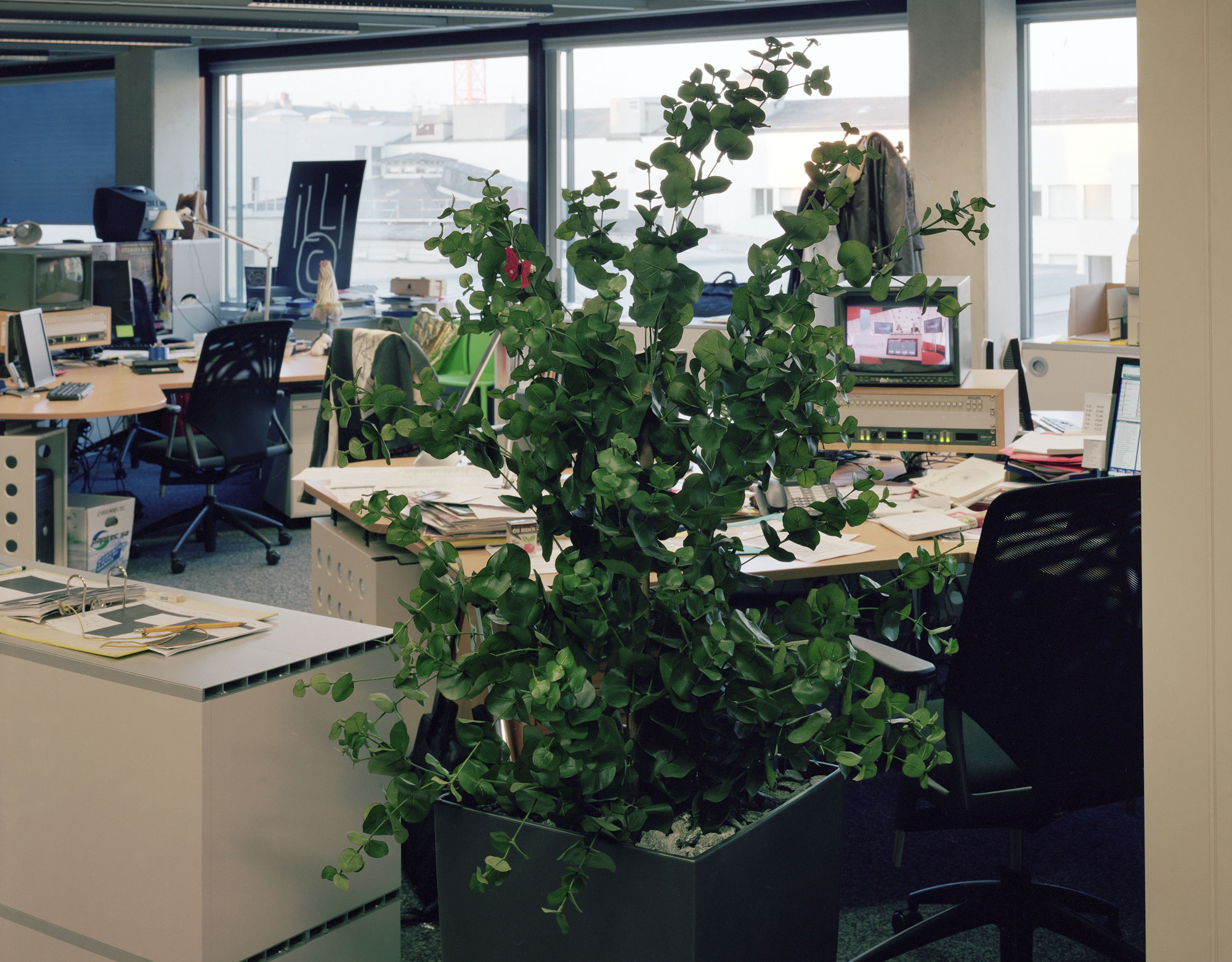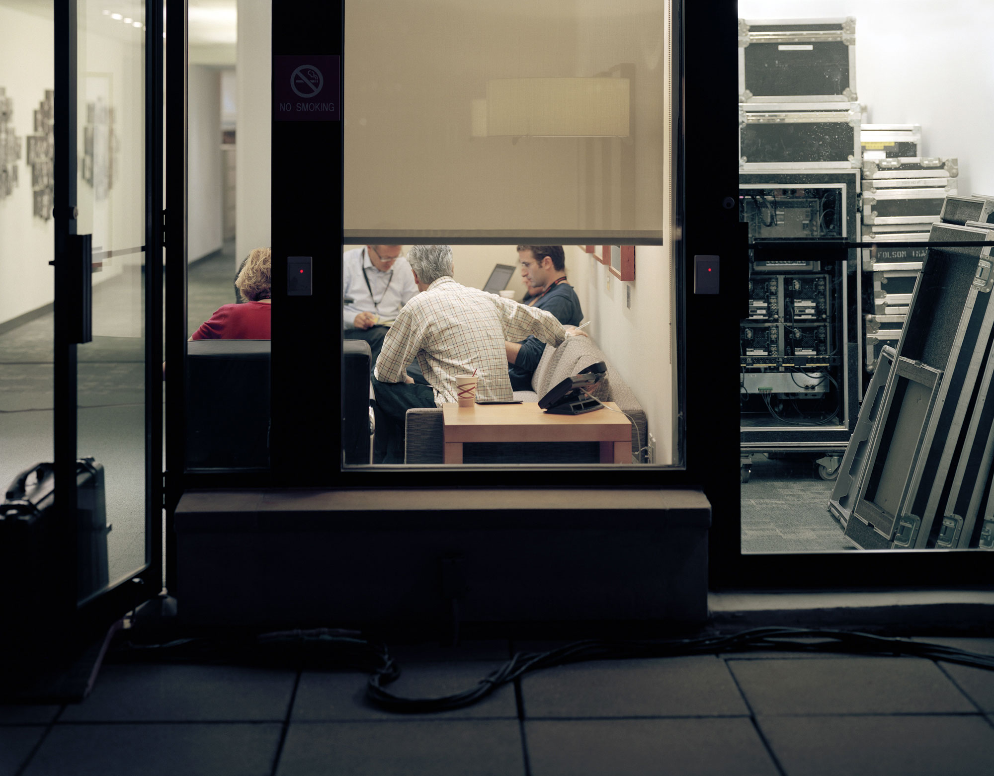Gezeigt werden Moderatorinnen in höchster Konzentration kurz vor der Live-Sendung, eine Tontechnikerin auf einer grünen Wiese wartend, ein menschenleeres Büro, Reporter bei einer Besprechung, oder Naturbilder, auf denen erst auf dem zweiten Blick allerhand technische Geräte zu sehen sind. Die Bildlegenden geben zwar Hinweise zum Geschehen, insgesamt lassen sie dem Betrachter jedoch viel Raum für die eigene Interpretation.