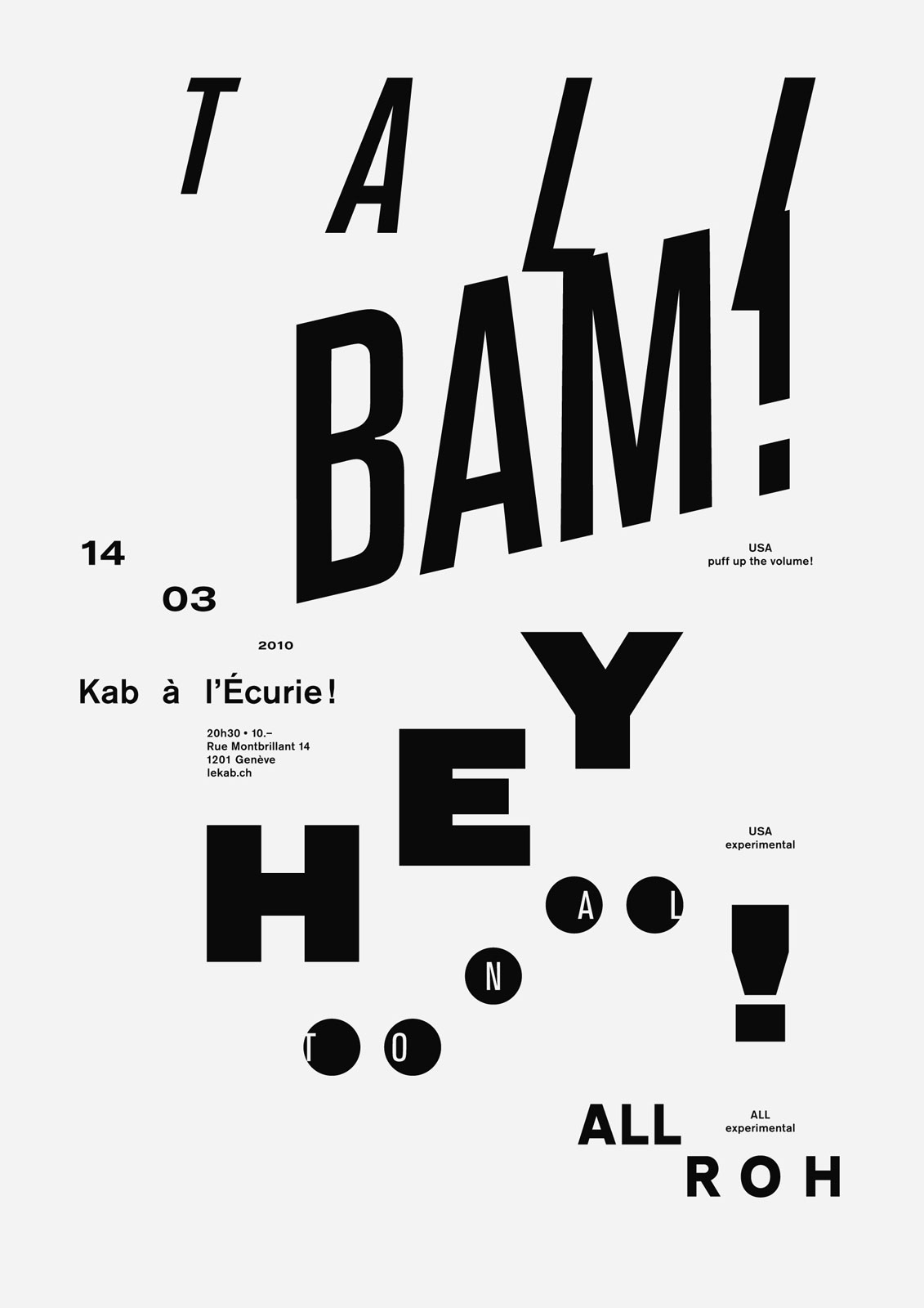 Für die beiden Grafiker sind die Aufträge von 'Le KAB de l'Usine' ein ideales Spielfeld. Ohne Einschränkungen und Hemmungen schaffen sie eine wiedererkennbare visuelle Sprache, deren Vokabular aus markanter Typografie, dynamischer Sequenzierung und monochromer Farbwahl besteht. Trotz dieses spielerischen und selbstsicheren Umgangs mit den gestalterischen Elementen sorgen Mamie und Todeschini dafür, dass die wesentlichen Informationen rasch erfasst werden können.