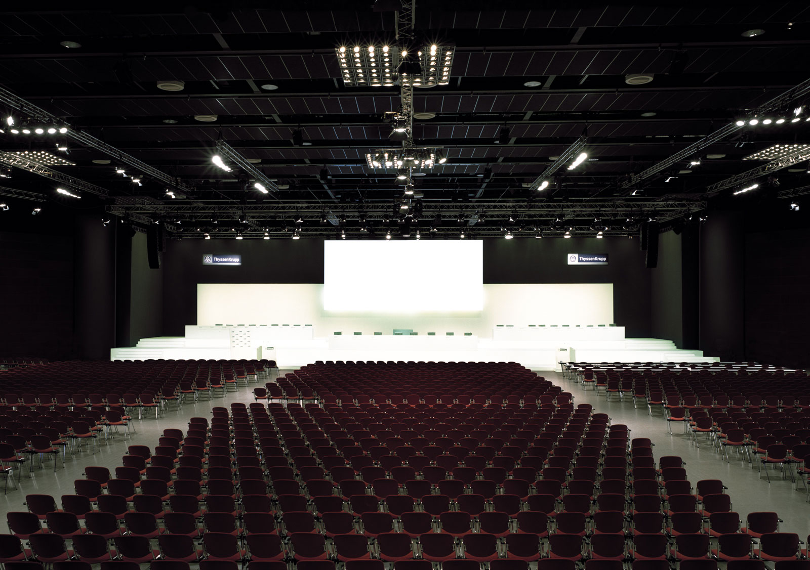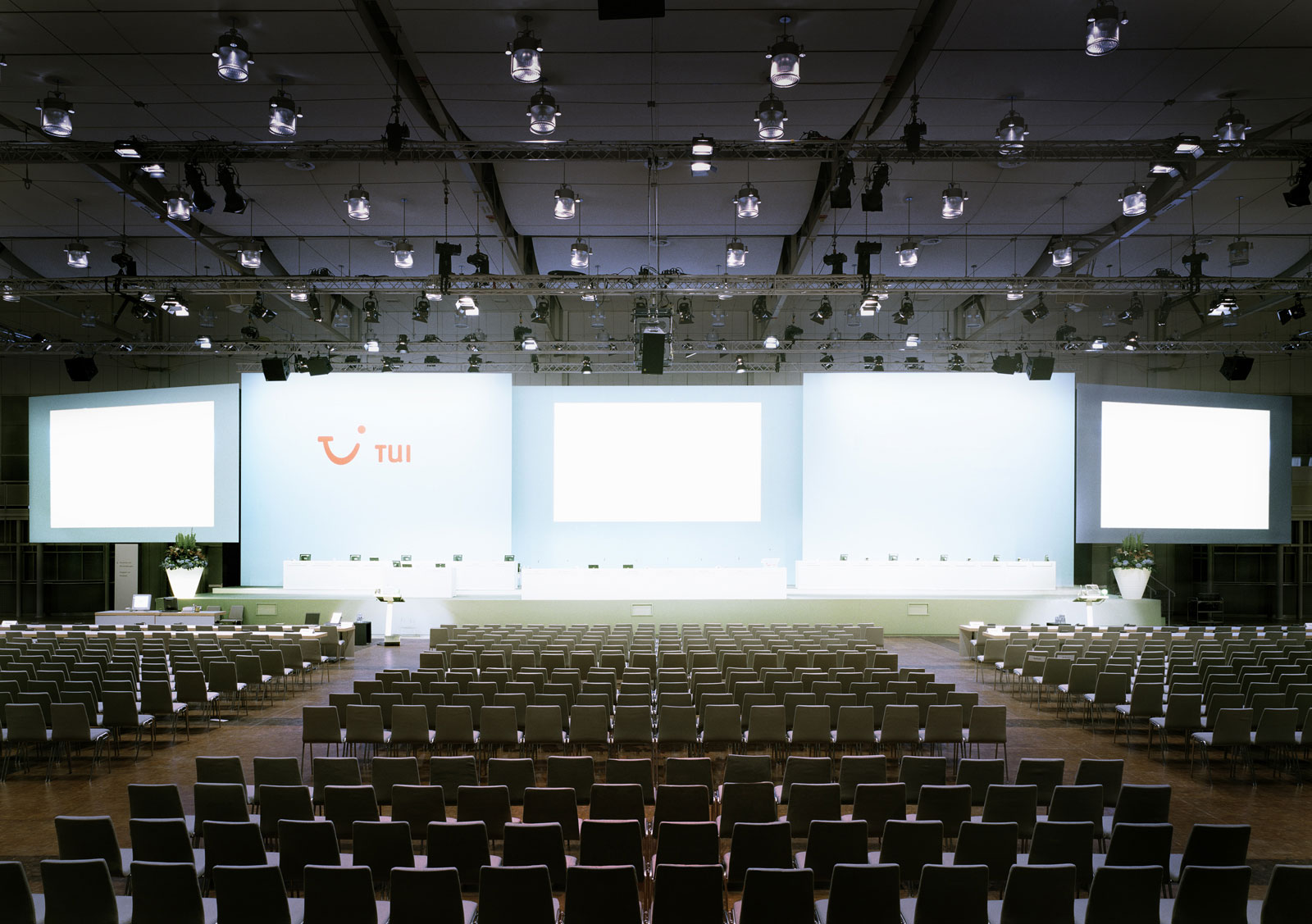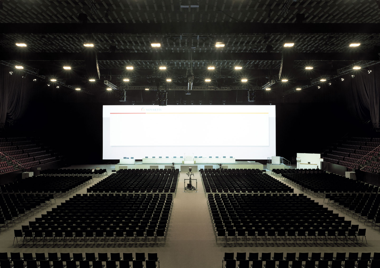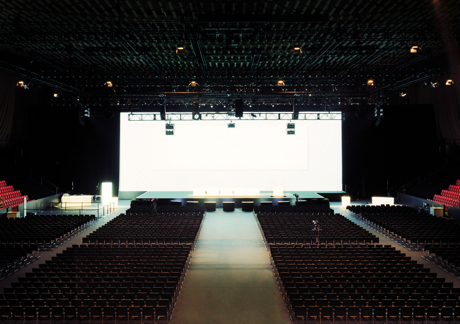 Mit der Arbeit 'Meetings' zeigt uns Cyril Porchet eine Serie von Grossbildfotografien, von Messehallen oder Vortragssälen kurz vor Aktionärsversammlungen grosser Unternehmen.
