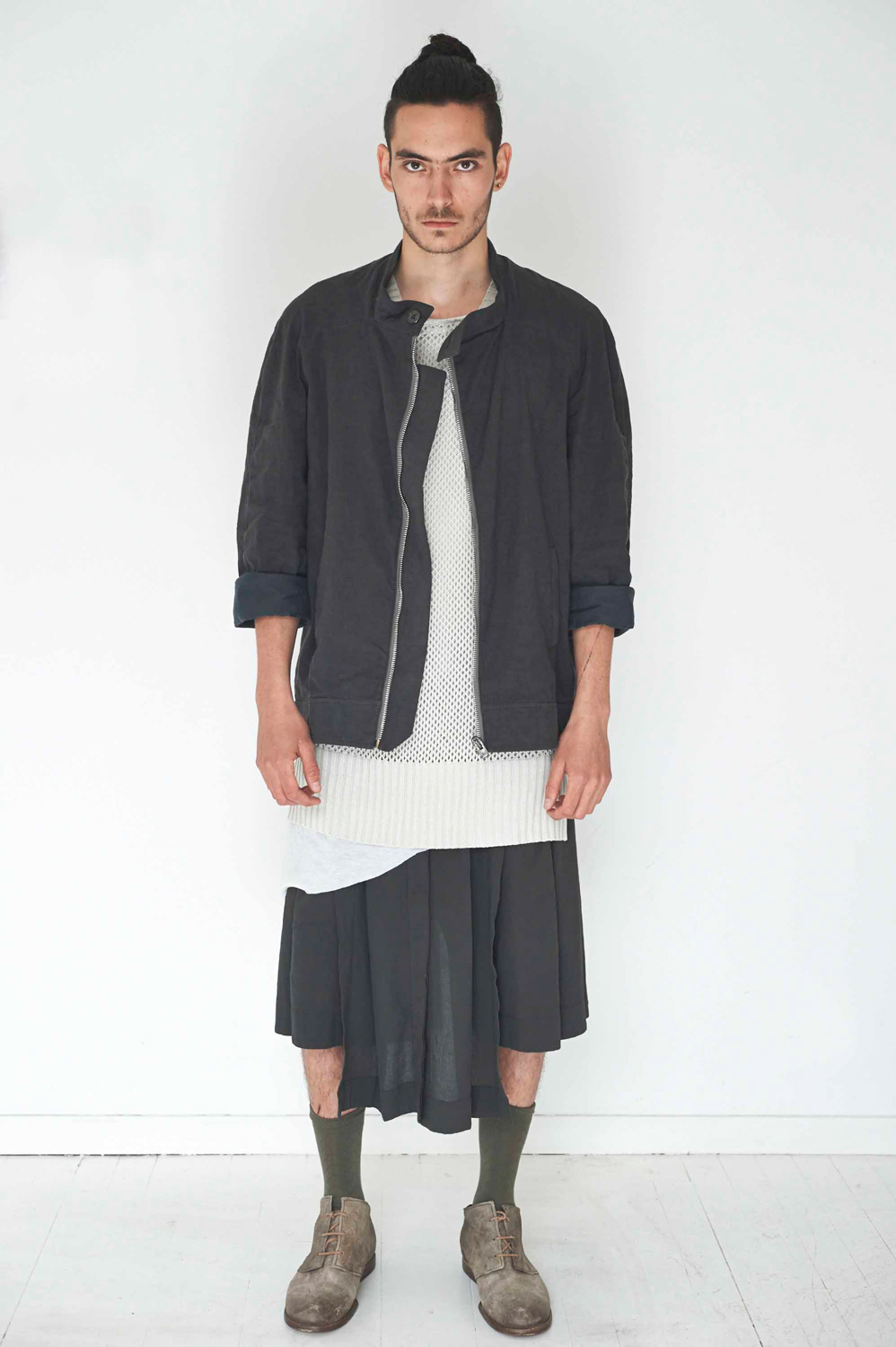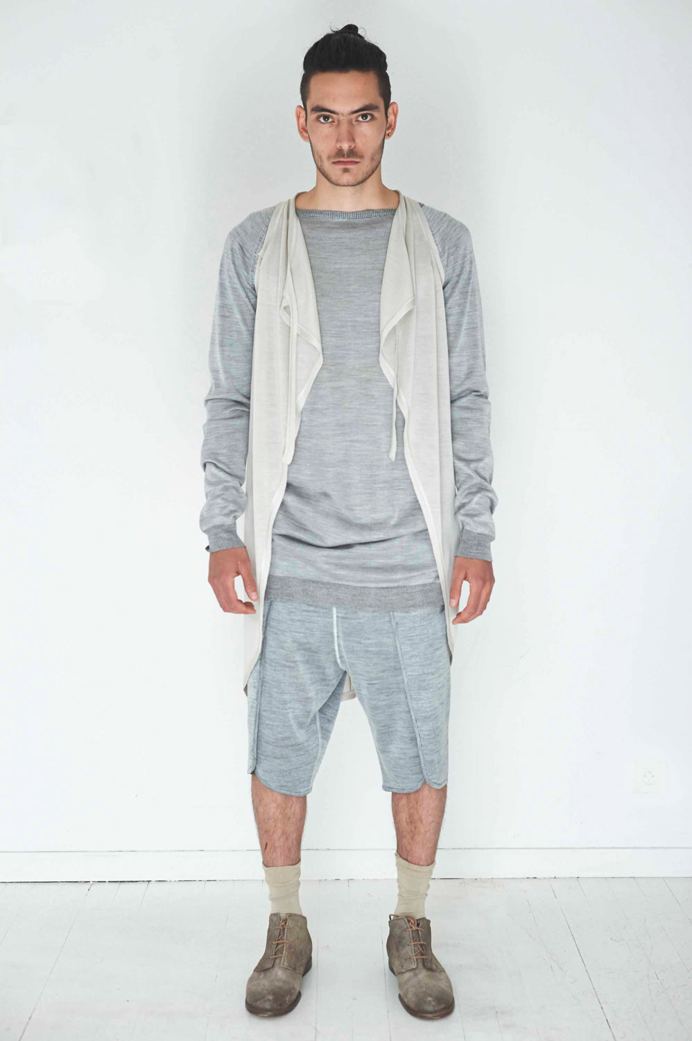 Die eingereichte Kollektion besticht durch die Klarheit der Schnitte und durch die Verwendung traditioneller Materialien, welche die Männermode sowohl visuell als auch haptisch neu erleben lassen. Sandro Marzo kombiniert in seiner Arbeit unterschiedliche natürlichen Materialien wie feines Leder, grober Strick, Filz, Leinen, Wolle, Kaschmir, Porzellan und Horn. Die verwendete Form- und Materialsprache erinnert dabei stark an die rurale, rauhe und karge süditalienische Landschaft, wo Marzos familäre Wurzeln liegen. Er verwendet klare, einheitliche Schnitte, die sich an liturgische Kleidung, Mönchskutten, priesterliche Gewänder und militärische Uniformen anlehnen. Klar ist auch die Farbpalette, die der Designer in seiner Kollektion verwendet; gedeckte Farben wie grau, weiss, schwarz, beige und dunkles Grün dominieren.