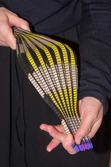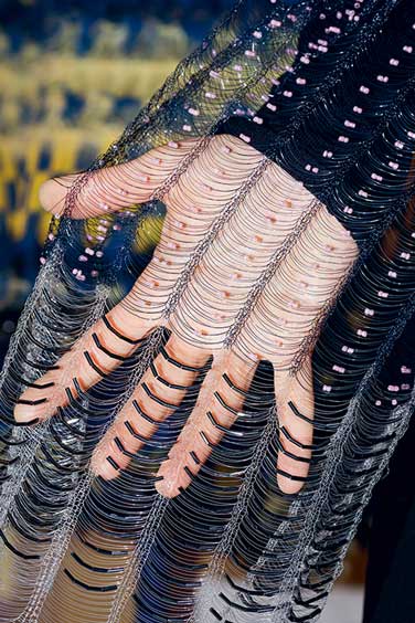 Cécile Feilchenfeldt zeigt mir gestrickte Stichproben, darunter einen Nylonvolant mit Perlen. Ich erinnere mich, diese regenbogenfarbenen Volants an der Fashion Week in Paris gesehen zu haben, in der letzten Kollektion von Schiaparelli, entworfen von Bertrand Guyon. Dass die eigene Arbeit als Unterschrift gilt, bringt eine gewisse Genugtuung mit sich, auch wenn nicht alle Modeschaffenden ihren Namen erwähnen. Eine Ausnahme sind Lutz Huelle und Walter van Beirendonck. Ich erkenne ihre gestrickten Stücke aus einer anderen Welt aber sofort: Gestricktes aus Nylon, Bast oder Holz, Farben, die sich mischen, Ideen, bewegte Skulpturen ...
