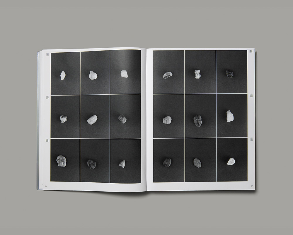 Das faszinierend befremdliche Künstlerbuch mit schwarz-silbernem Umschlag zeigt tausende von Kieselsteinen in systematischer Anordnung. Auf gegen 500 Seiten sind jeweils neun schwarz-weisse Fotos einzelner Steine strikt regelmässig arrangiert. Ohne jegliche Informationen fehlt die Orientierung, dafür lassen sich die einzelnen Steine in ihren Unterschieden betrachten. Das Buchobjekt wird an die Grenzen des Absurden getrieben, aber es erweist sich als durchaus geeignet für eine solche Materialpräsentation und kann hier geradezu als eigentliches künstlerisches Werk gelten. Der nüchterne Titel verweist auf alltägliche Verwendungen von Kieselsteinen und kontrastiert mit der hohen Wertschätzung, die den Steinen in den einzelnen Bildern zukommt. Frei bewegliche Folien mit farbigen Renderings von Gebäuden und Landschaften unterbrechen die Abfolge der Steinbild-Seiten und verändern durch Überlagerung deren Bedeutung. Ein integrierter, kurzer Textteil enthält einen Essay in deutsch und englisch (silber) sowie das Impressum (schwarz). Die elegante Typografie trägt zur starken gestalterischen Haltung der Publikation bei, während die Lesbarkeit ein eher sekundäres Ziel war.