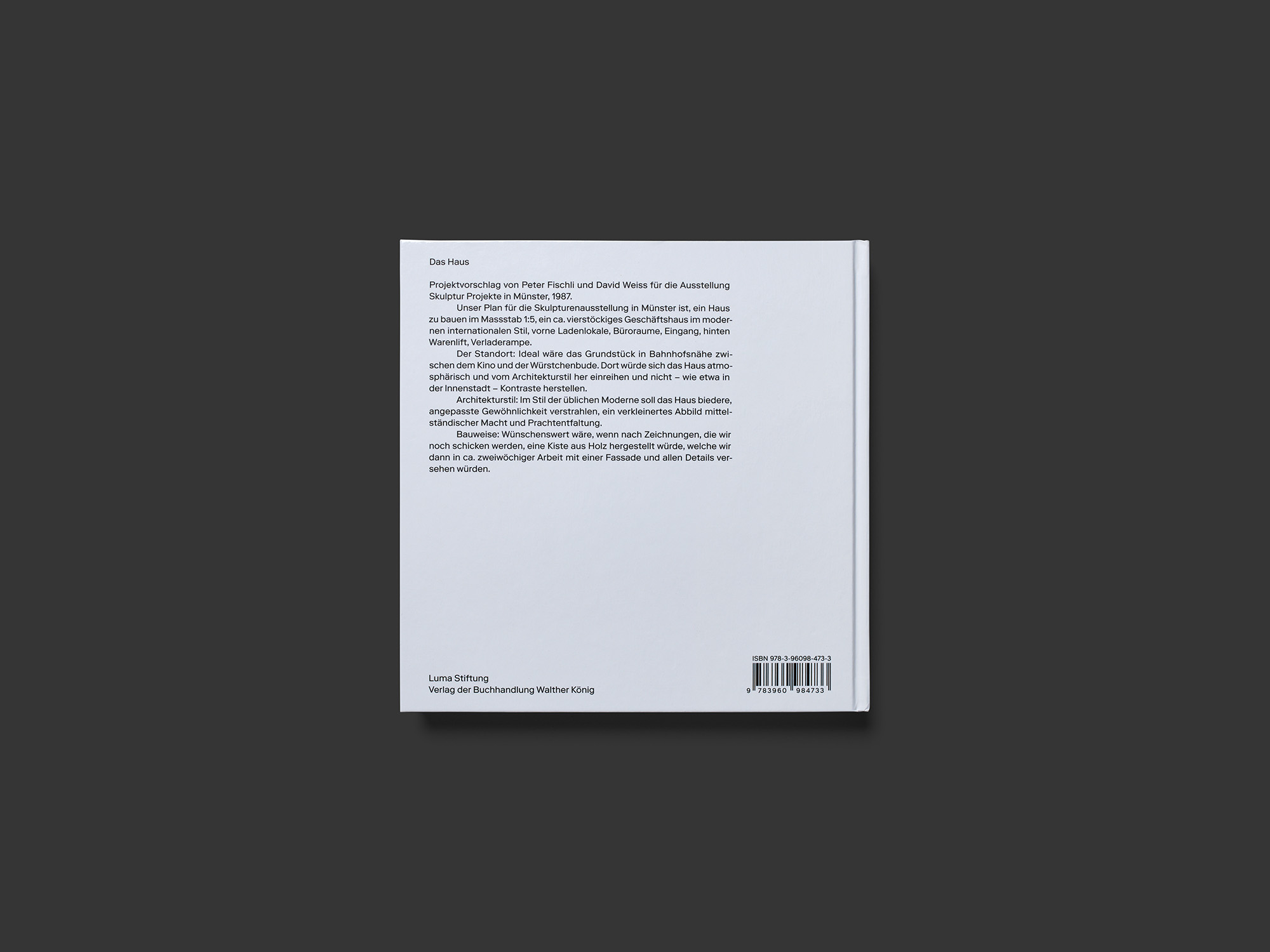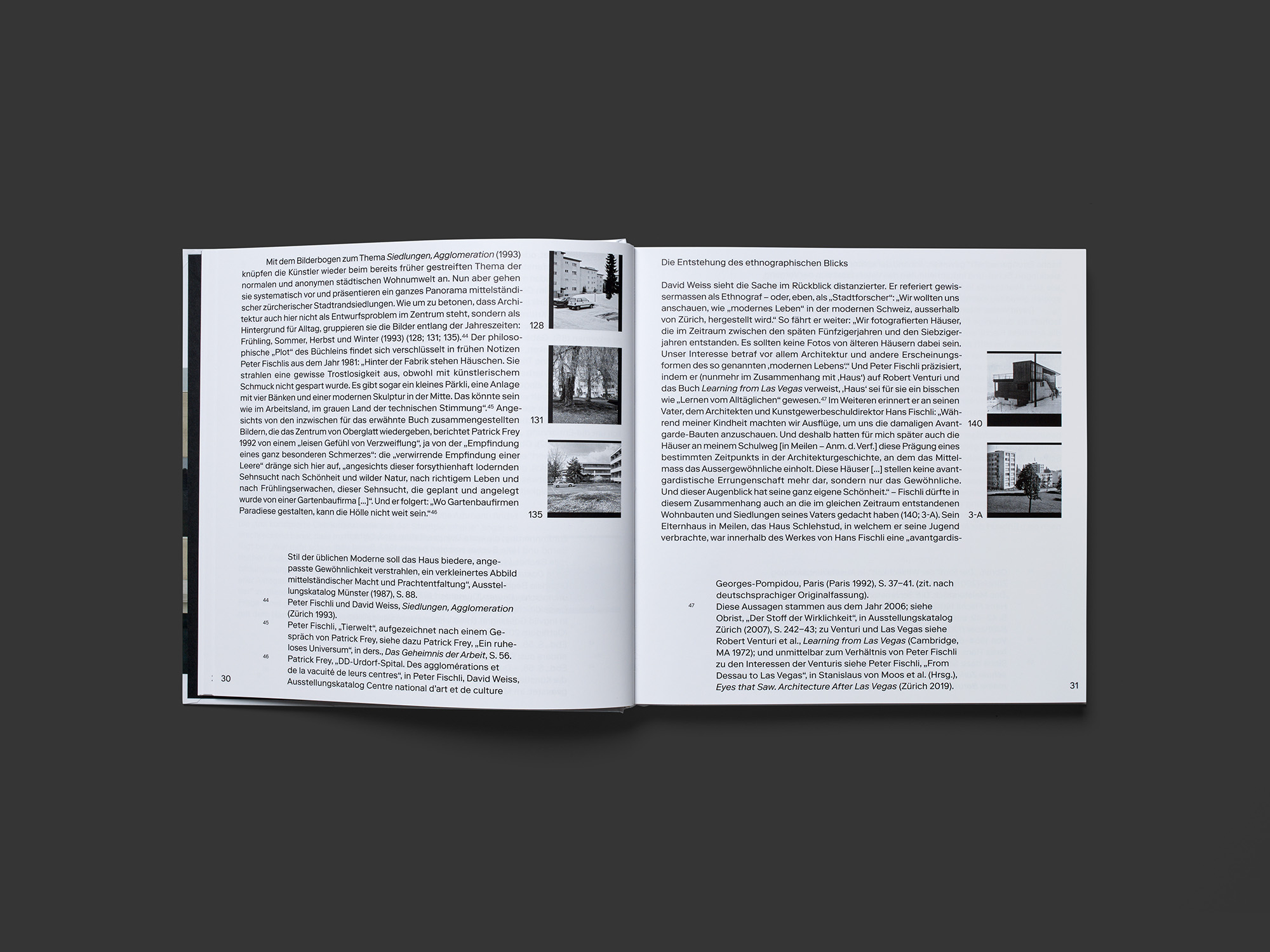 Ein eher kleinformatiger, quadratischer Band mit Hardcover macht die mehrmals gebaute Installation Haus (1987 / 2018) von Fischli und Weiss in einem einladenden Zusammenspiel von Text und Bildern neu zugänglich. Der erste Teil enthält einen langen Essay des emeritierten Zürcher Kunsthistorikers Stanislaus von Moos, der gemeinsam mit Peter Fischli auch für die Konzeption des Bandes zeichnet. Das asymmetrische Layout bietet jeweils am rechten Seitenrand Platz für bis zu drei Referenzabbildungen, die durch schwarze Balken auf identische Quadrate ergänzt sind. Einige Abbildungen treten vergrössert und in neuer Reihenfolge im Bildteil wieder auf, der gegen 200 Fotografien einzeln pro Seite so zeigt, dass immer rechts und links oder oben und unten zwei weisse Ränder bleiben. Das anschliessende Verzeichnis gibt Aufschluss über die Herkunft des diversen Materials, das neben der Werkgeschichte von Fischli / Weiss auch architektur- und kunstgeschichtliche Kontexte erschließt: Max Bill, Hans Fischli, Alison und Peter Smithson, etc. Die Bildredaktion ist hervorragend, und die historische Perspektive wird durch das Format des Bandes unterstrichen, das an Bücher aus der Hochphase des Swiss Design erinnert.