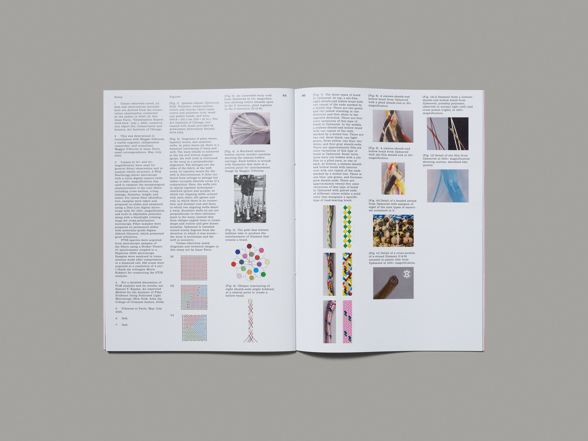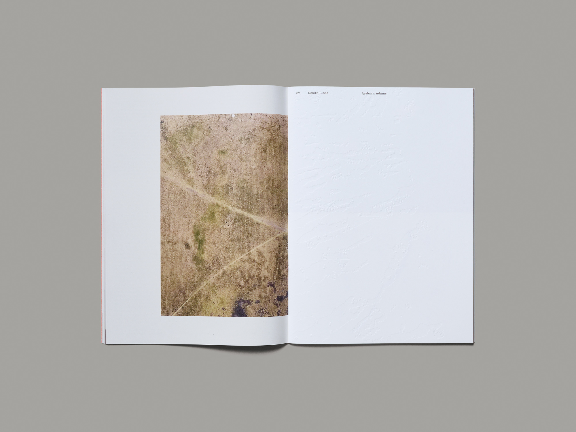 Wie ein frischer Windstoss zwischen den vielen schweren Kunstbüchern wirkt Igshaan Adams’ dünner Ausstellungskatalog mit orangem Softcover und minimalistischer oranger Fadenheftung. Der äusserst weiche Umschlag aus einem Einbandmaterial und das dünne Papier erwecken den Eindruck von Fragilität. Dies reflektiert die feinen Gewebe und raumgreifenden Installationen, die der Südafrikaner aus gefundenen Materialien – von alten Linoleumböden und Teppichen bis zu Kabeln, Plastikschnüren und anderem Abfall – herstellt. Die oft bunten Muster, die dabei entstehen, erzählen dicht verwobene Geschichten von lokalen Kulturen, gesellschaftlichen Strukturen und politischen Konflikten, meist auf Kapstadt fokussiert. Der inhaltlichen Komplexität des Werks entspricht es, dass der Katalog hauptsächlich aus einem Dutzend Texte besteht. Sie sind in einem dreispaltigen Layout gesetzt, in welches Werkabbildungen und Ausstellungsansichten in unterschiedlichen Grössen und Formaten wie zufällig eingeschoben sind – meist teilweise von Text überlagert. In der Mitte des Hefts ist ein 40-seitiger Fotoessay auf einem dickeren Papier eingebunden, der Adams’ Arbeitsweise anhand von Abfall-Fundstellen, Materialsammlungen und Entwürfen dokumentiert. Die offene Auslegeordnung lässt die Betrachtenden nahe an den künstlerischen Prozess herantreten – als könnten sie selbst Fundstücke auswählen und zusammenstellen.