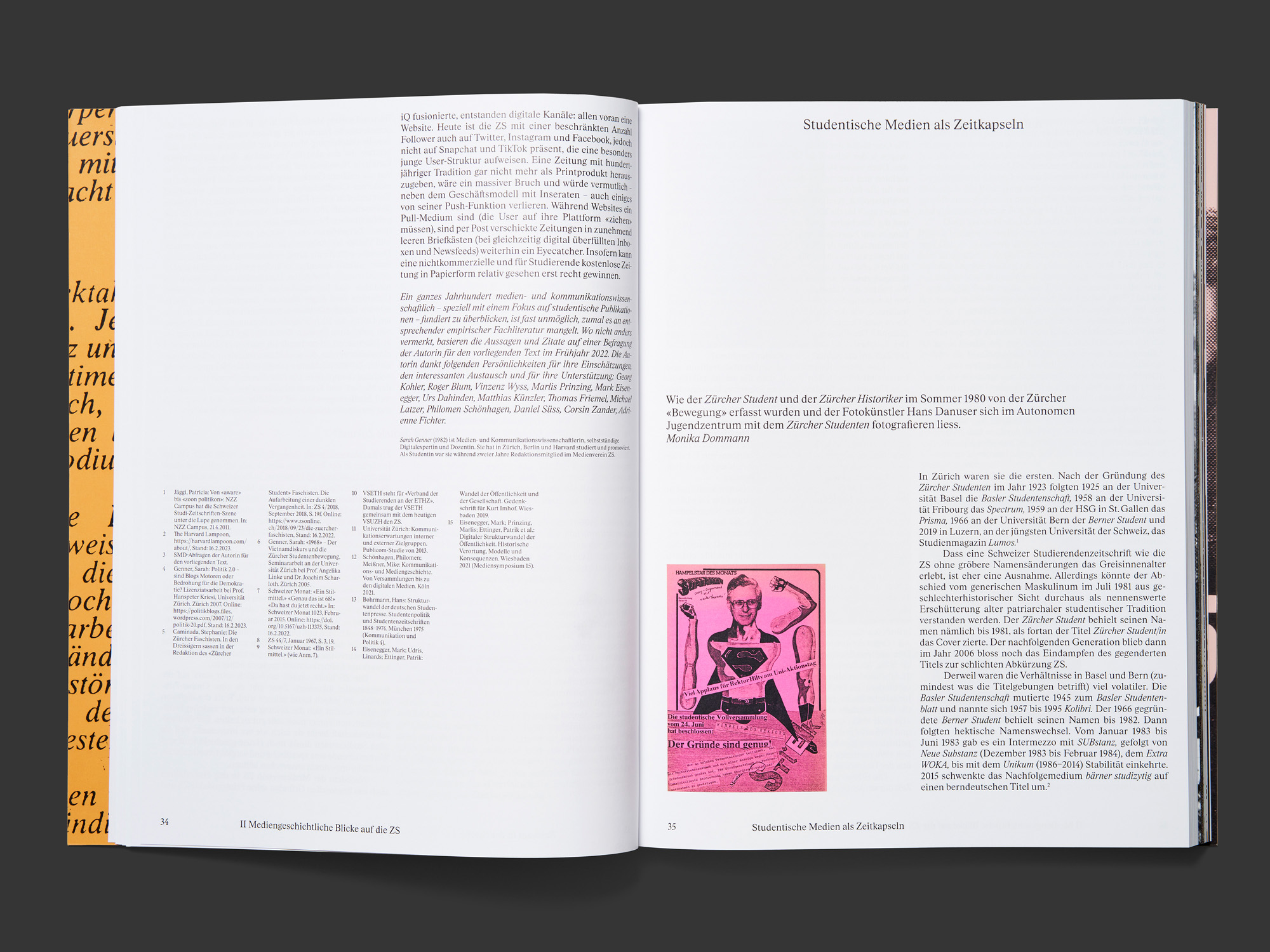 Die grossformatige, schwere und sehr biegsame Publikation zum 100-Jahr-Jubiläum der Zürcher Studierendenzeitschrift ZS ist ein reich gefülltes feeling book, das dank überlegter Gestaltung und optimalem Druck auf schönen Papieren zum Verweilen einlädt. Als Schutzumschlag für das Softcover dient ein gefaltetes Poster mit vier eingefärbten, stark vergrösserten Ausschnitten aus der Zeitschrift. Der erste Teil des Buchs enthält zwei Dutzend Textbeiträge von ehemaligen Mitarbeitenden, die in einspaltigem, asymmetrischem Layout mit Serifenschrift und gelegentlichen Abbildungen in der Randspalte gesetzt sind. Der zweite Teil besteht aus einem dünneren Papier und ist vollständig mit mehrheitlich randabfallenden,