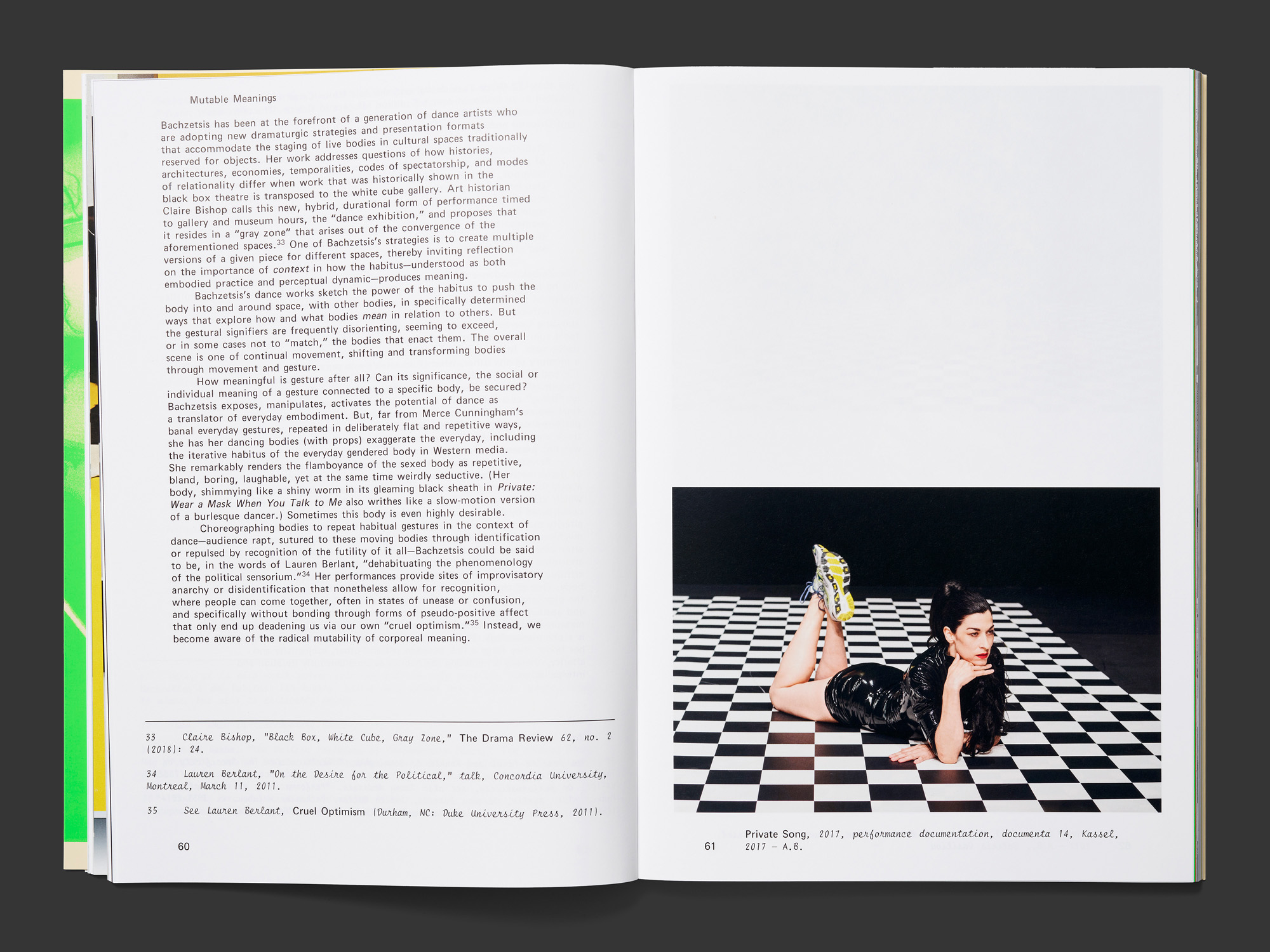 Dazu kommen drei visuelle Essays und zwei poetische Beiträge, die auf farbigen Hochglanzpapieren in speziellen Schriften gesetzt sind. Die verschiedenen Bestandteile fügen sich zu einer eklektischen Show zusammen, so wie Bachzetsis auch in einzelnen Stücken oft mit wechselnden Szenen, Kostümen und Lichtverhältnissen arbeitet. Alles ist voller Energie und Leben. Der neongrün bedruckte Schutzumschlag aus Vinyl bietet in Kombination mit dem Buchdeckel aus Karton einen Vorgeschmack auf die kontrastreichen Darstellungen im Innern. Es gibt sehr viel zu sehen, aber das Buch wirkt an keiner Stelle überladen oder manieriert.
