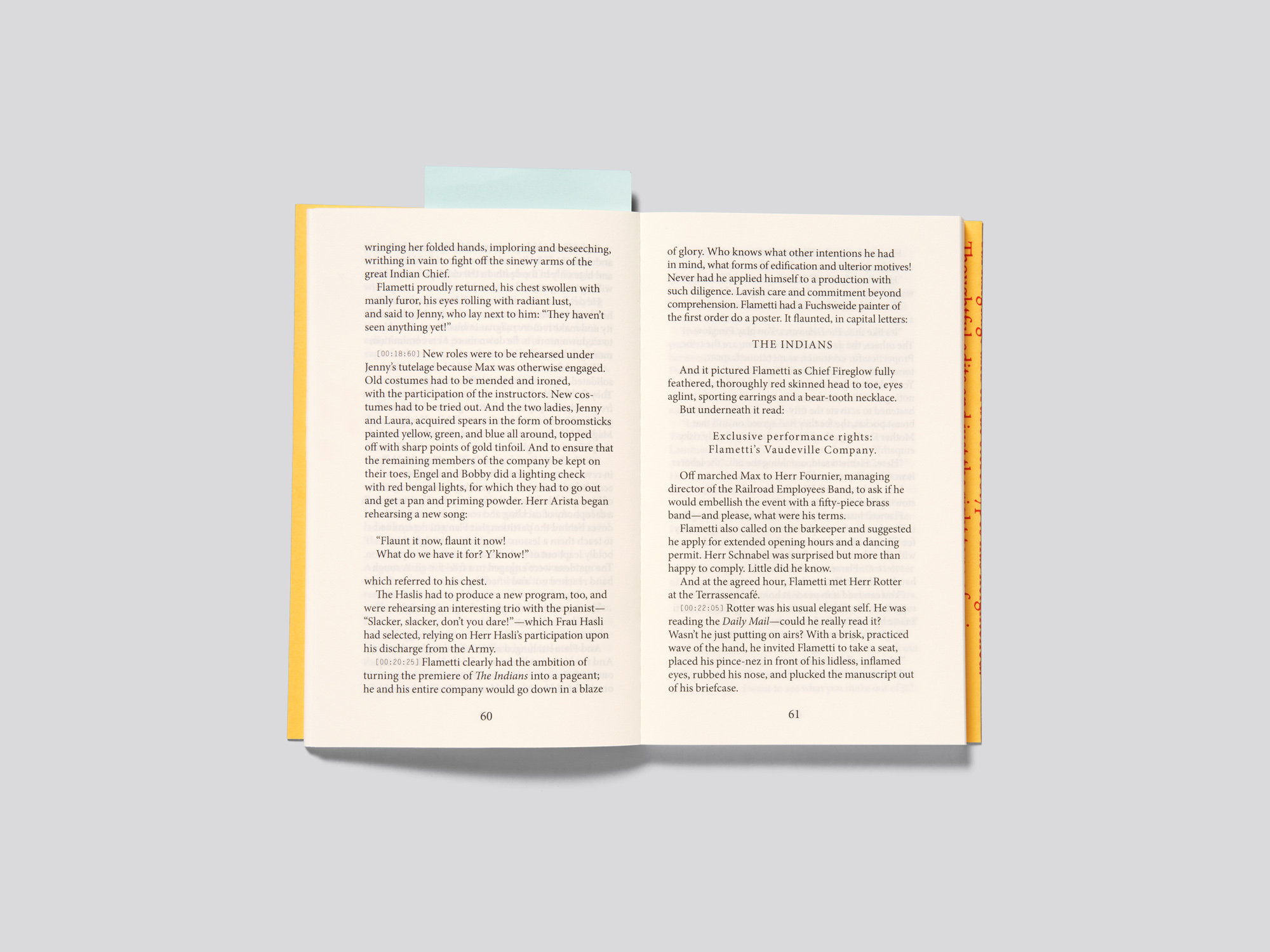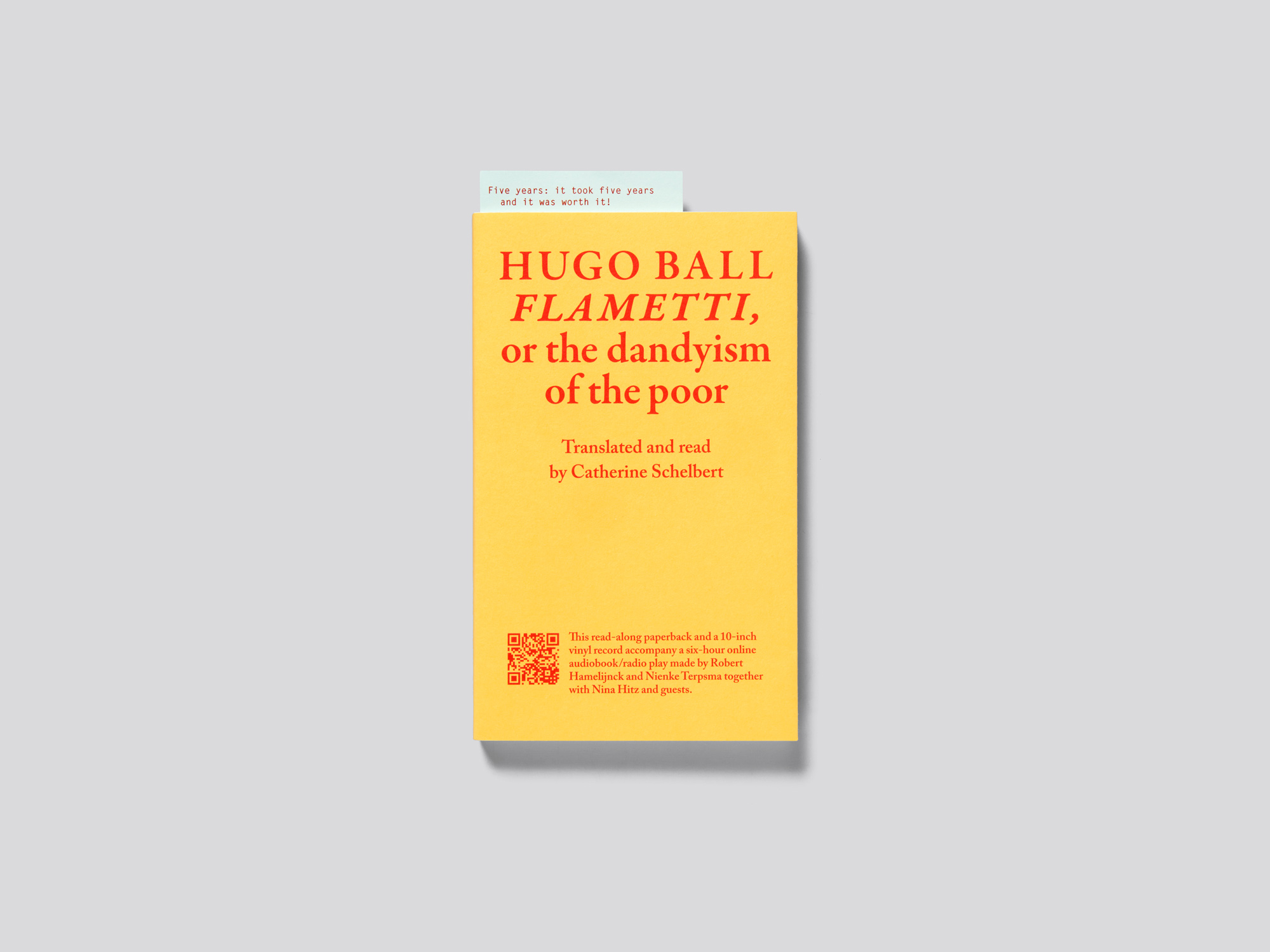 Ein kleines Taschenbuch bildet mit einer Vinyl-Schallplatte und einem Online-Hörbuch ein eklektisches Ensemble, das die multimediale Konstellation entspannt und charmant in Szene setzt. Das Buch enthält eine erstmals vor zehn Jahren erschienene englische Übersetzung einer Novelle von Hugo Ball (1886 – 1927), die nun in neuer Gestaltung erscheint. Zugleich initiierten die Gestalterin und ihr Co-Herausgeber ein Online-Hörbuch mit einer Lesung der Übersetzerin und Musikbegleitung. Auszüge aus dem Hörbuch sind auf der Vinyl-Platte enthalten, die in einer üblichen quadratischen Plattenhülle steckt und als physikalisches Duo mit dem Buch in einem transparenten Plastikumschlag geliefert wird. Die beiden Formate passen offenkundig nicht zusammen, und auch farblich gibt es Unstimmigkeiten, denn obwohl der Schutzumschlag des Taschenbuchs, die Plattenhülle und das Vinyl mitsamt einem quadratisches Begleitblatt alle gelb-rot und in einheitlicher Serifenschrift gedruckt sind, handelt es sich um nicht weniger als vier verschiedene Gelbtöne. Dies lässt sich als ironisches Spiel mit der Inkompatibilität der Medien oder als Hinweis auf die vier verschiedenen Materialien lesen – auf jeden Fall werden die Kontraste zwischen den Objekten bewusst akzentuiert, anstatt eine vermeintliche Einheit zu schaffen, wie dies z.B. bei CDs in Büchern häufig geschieht. Auch der Stellenwert des gedruckten Buches wird bewusst und halbironisch hinterfragt, indem der zum Hörbuch führende QR-Code prominent vorne auf den Schutzumschlag gedruckt ist. Das Ganze ist ein dreiköpfiges Monster, das in seiner Einzigartigkeit ein Sammelstück abgibt, aber zugleich sehr zugänglich ist.