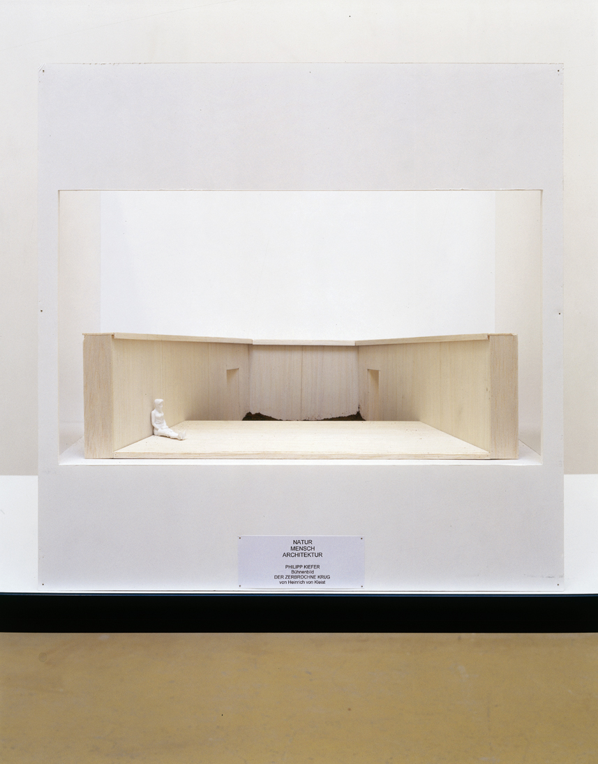 The set for Heinrich von Kleist's comedy 'Der Zerbrochene Krug' ('The Broken Jug') includes interior and exterior areas within its scenic architecture. It consists of a space with a tapering perspective, structured like a peepshow. The simple, reduced stage structure makes for an extremely concentrated playing area, with the space clearly divided into two levels horizontally. Philipp Kiefer skilfully exploits this abstracted spatial situation by making the horizon into a rope, visually, the leading character into a tightrope walker. Thus the interior symbolizes the situation of the judge Adam, who is increasingly driven into a corner: it becomes a trap for him, a grave that he has dug for himself. The visible space reflects the inner world of the person very impressively, and functions as a convincing metaphor of his state of mind. The solid, clean-cut costumes are made of felt. They are rigid envelopes that considerably restrict the characters' room for manoeuvre and thus express great inhibition.