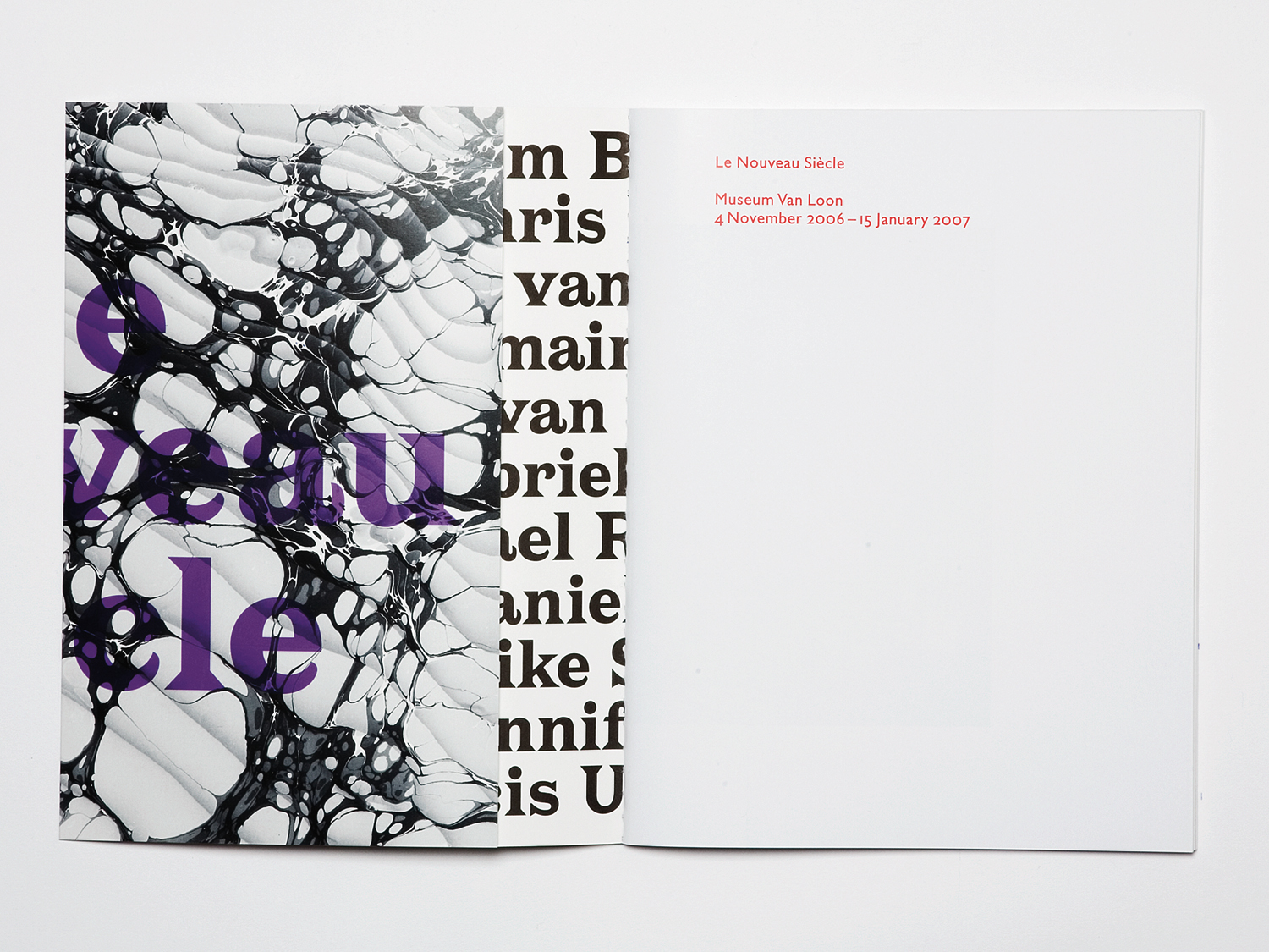 For the exhibition catalogue 'Le Nouveau Siècle', Julia Born (with Lorenz Brunner) builds the chief characteristic of the exhibition venue – its symmetry – into the book design. The Gracht House dating from 1672 follows the rules of symmetry completely, even where it has no function. For example, false doors are included, or patterns extended merely for the sake of perfection. The two graphic designers take over the idea of symmetry as follows: they structure the content rigorously, and centre it in part. They have also devised a pictorial section of their own showing items and places in the building that conceal an element of asymmetry within themselves despite symmetrical composition. The title on the cover is folded in as a flap on its central axis at the back and the front. As the title is presented twice, half of it each time, it remains intelligible as a whole on the cover. Both these books show clearly how Julia Born transforms content into design.