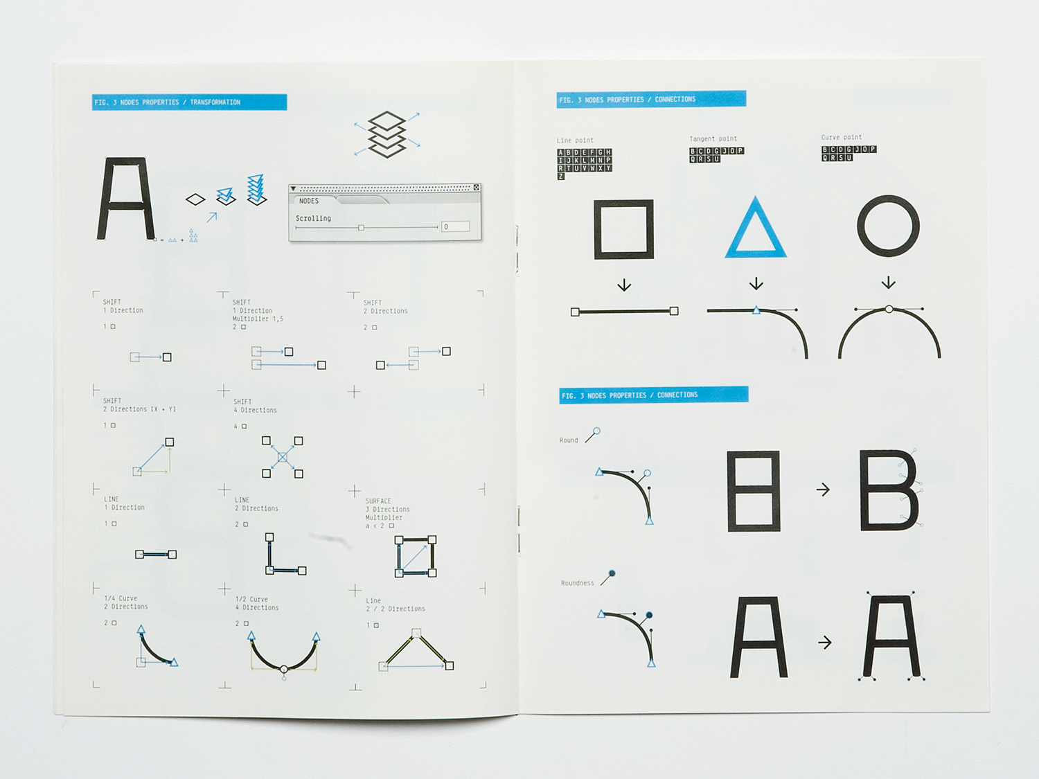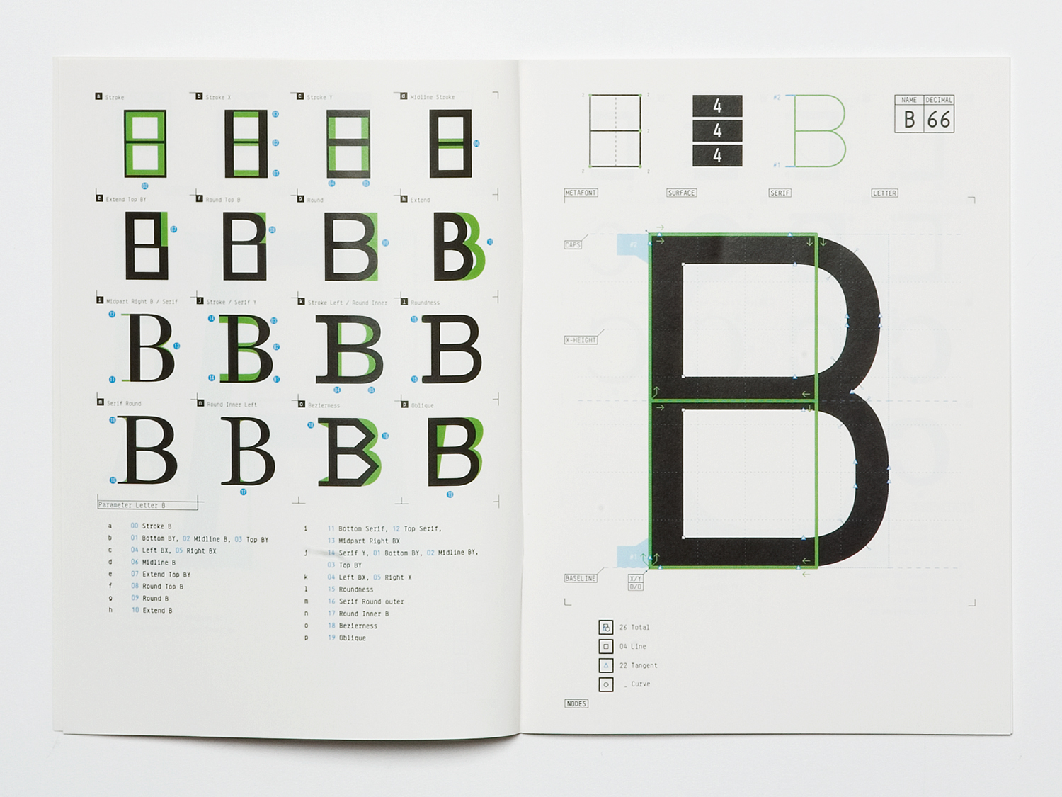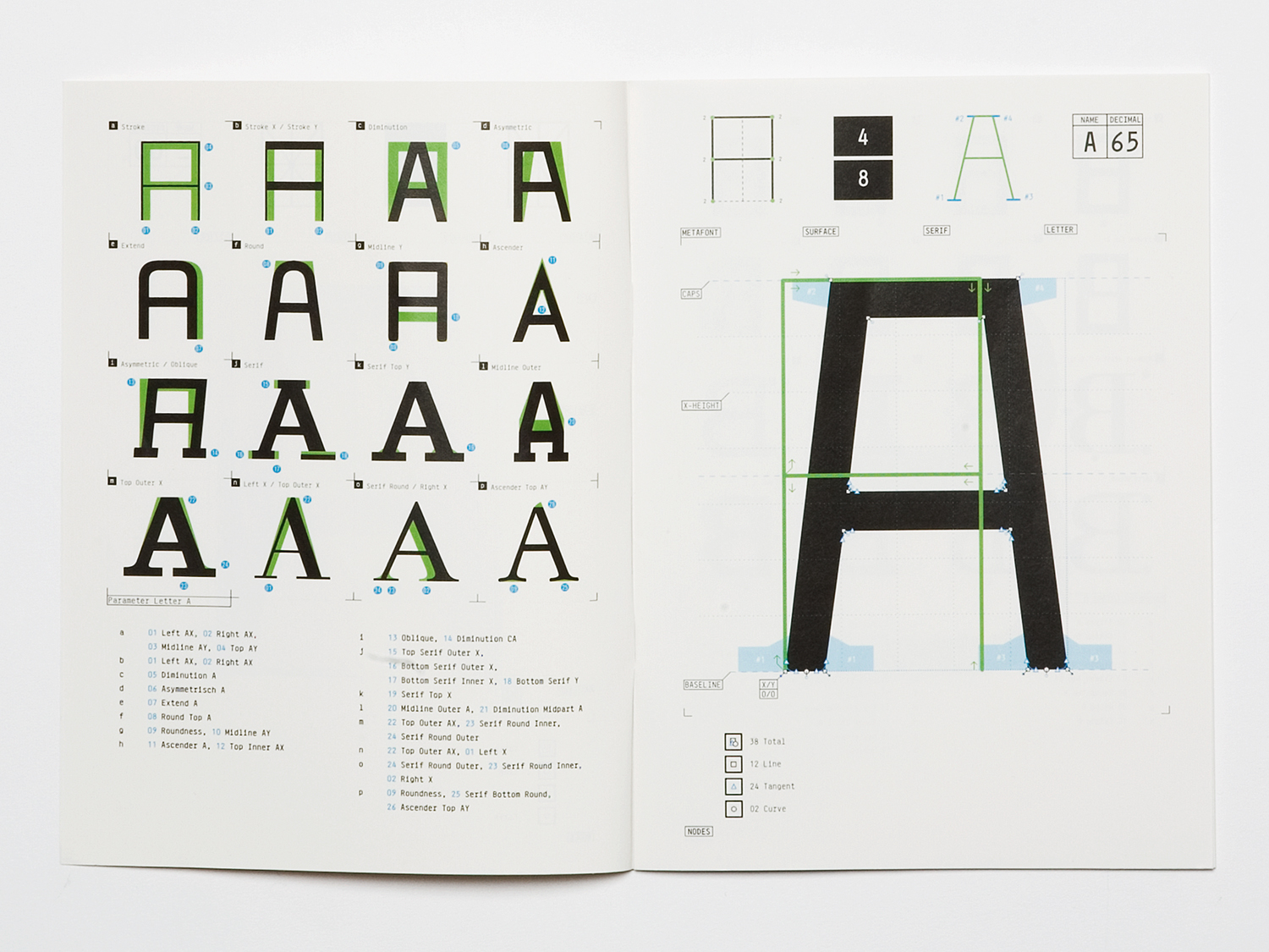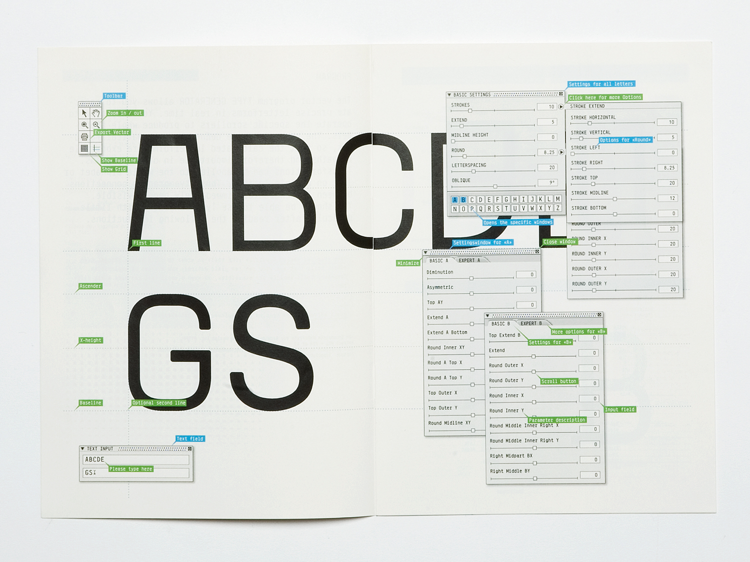 The two graphic designers Remo Caminada and Ludovic Innocent Varone have presented a program for designing fonts as a diploma project at the Hochschule für Gestaltung und Kunst Zürich. Users are able to intervene in various ways, starting with a base font. Radii, lines, heights and oblique positions can be altered using manipulation devices or by inputting numerical values, and serifs can be generated as well. The interventions can be applied to a single letter or the whole font, as wished. The manipulations are shown on the screen at the same time, and the changes can be immediately checked, accepted or rejected. The commands are arranged in windows, in the way familiar from popular design programs such as 'Photoshop' and 'Illustrator'. The windows can be opened and closed, and lead to other options. A small range of tools is also available. In addition, Caminada and Varone have written and designed a short account of the program with instructions for use, as well as the program itself. This shows various examples of which intervention is required to produce a particular result. The fonts generated by the vector-based program can be exported to other applications and developed further there.