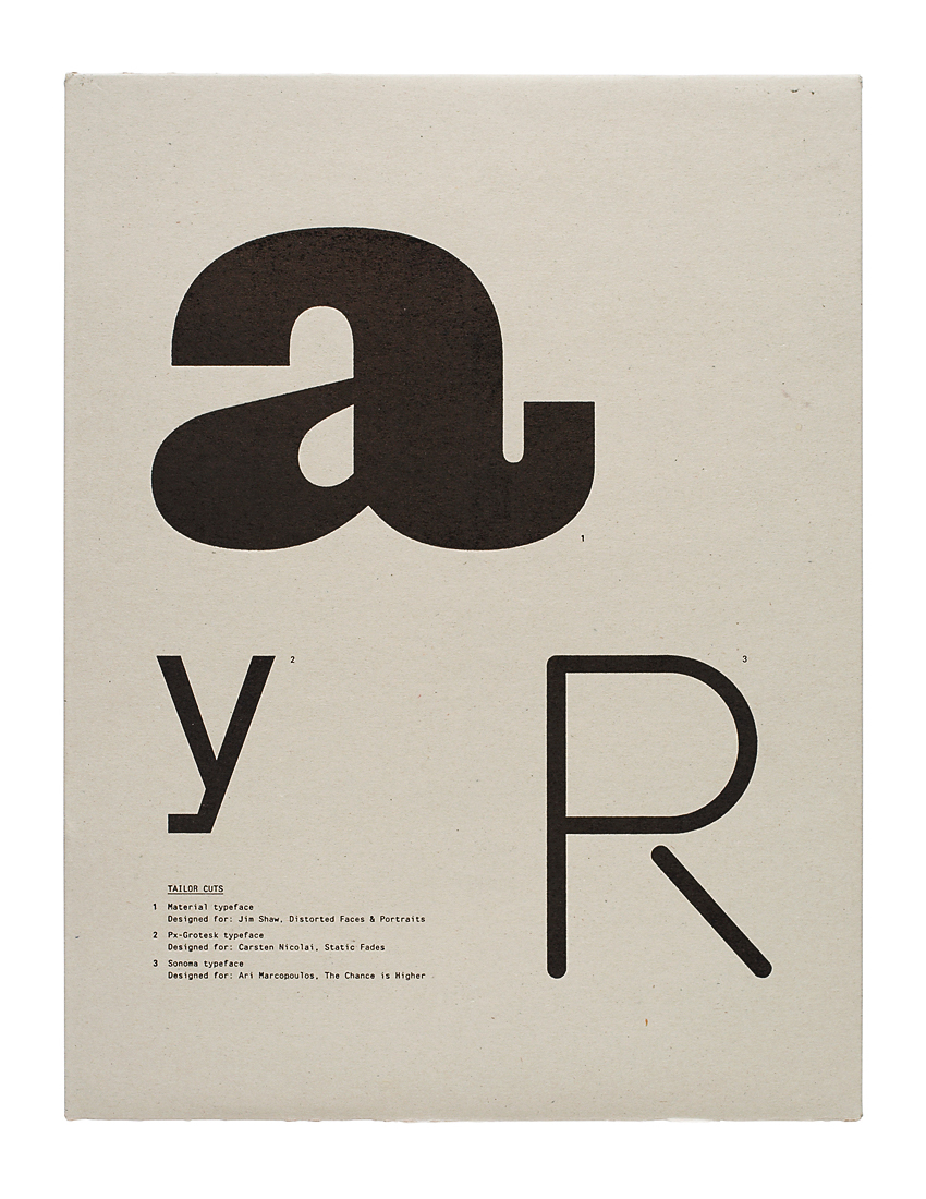 The work 'Taylor Cuts' consists of three artist books designed by graphic designer Nicolas Eigenheer, for each of which he developed a font consistent with the contents.