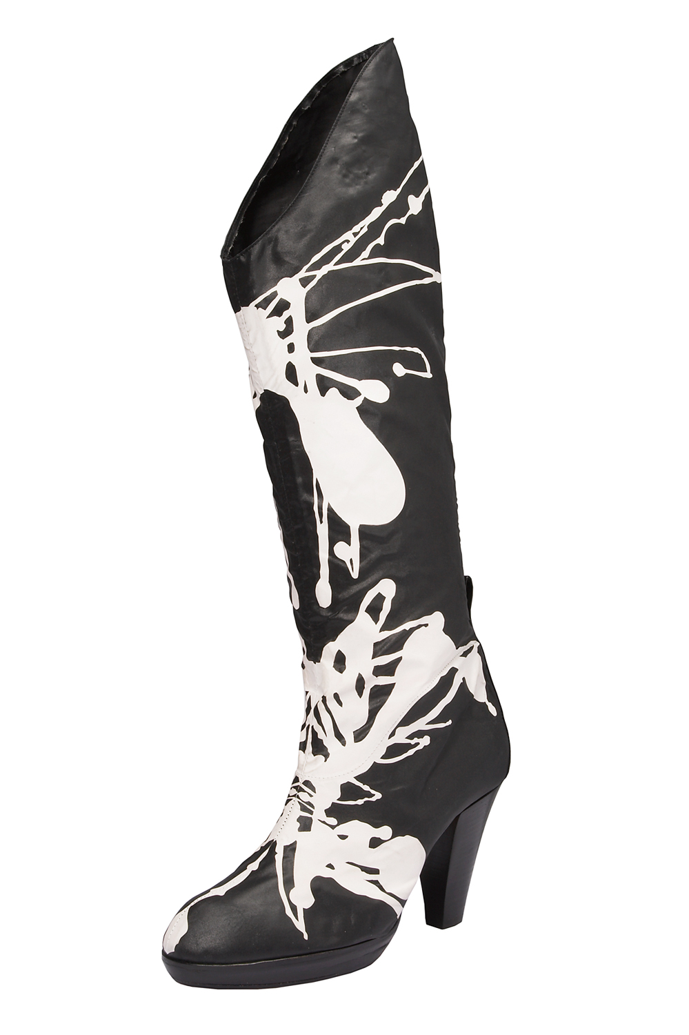 She was awarded the grant for her 2007 summer collection, consisting of seven women's shoe models named 'Rorschach', after the eponymous psychodiagnostic inkblot test. Anita Moser used these inkblots as a starting point for her collection. An important feature of it seems to be a sense of abstraction. She does not simply borrow the famous folding images used in the test, she develops them. The symmetrical inkblot outline is printed or appliquéd as a cut-out leather pattern onto both light nylon fabric boots, which makes for an exciting interplay between the decorative element of the blot and the stoutness of the boot. The sandal is made of tanned cow leather. The black shine of the cut-out inkblot and determines the shape. The milk-white, pale red and loam-coloured pumps fool the eye of their beholder. At first, you are confused because the surface seems to recreate a plaster cast. However, the pumps have a string decoration that can be made out under the fine nappa leather. A double leather sole, slightly shifted back, creates an impression of the shoes floating above the ground. These are shoes that will not leave you cold. They challenge you and change the wearer's gait.