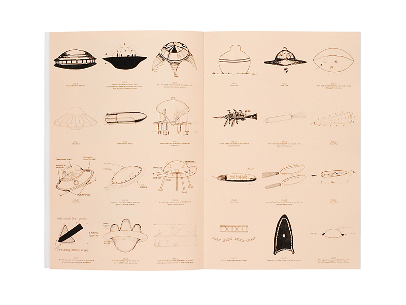 Under the title of 'Strange shapes of things (that fly)' Katja Naima Schalcher presents her diploma work in the form of two bound publications created in 2007 at the Zürcher Hochschule der Kunst (ZHdK). The main elements of this very elaborately designed work are modern myths and conspiracy theories. She uses the UFO myth as a tool for researching the origins and nature of these myths and theories. Lou Zinsstag, of Basel, has carefully compiled an archive of unknown flying objects and this provides the starting point for the research. Eye-witness accounts, newspaper articles and pictures document the numerous stories of eerie sightings since the 1940s, featuring objects ranging from the classic saucer via inexplicable flare constellations to the flying potato.