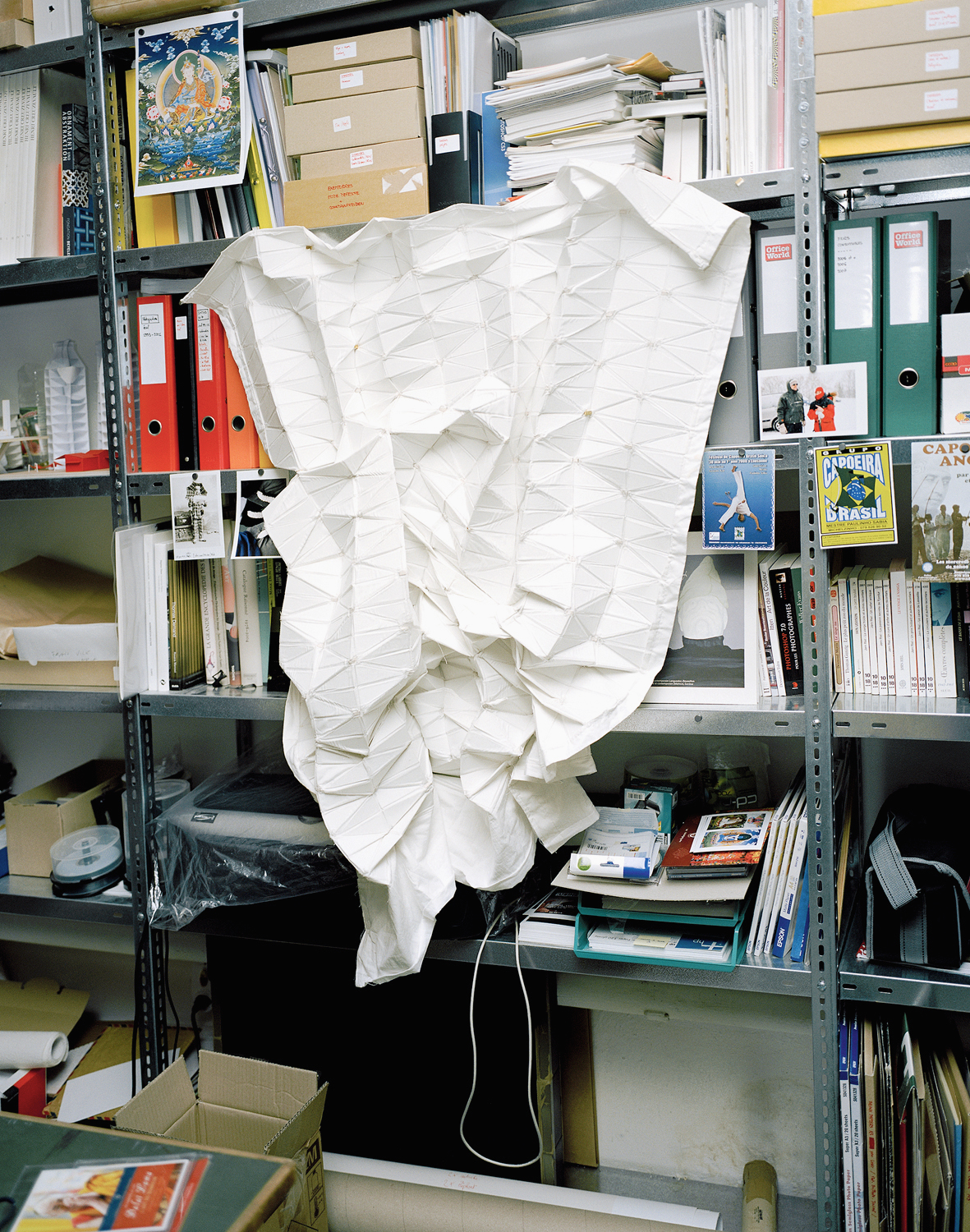 The Magnetic Curtain can be modelled into any shape. Its built-in structural components keep it in the desired form that has been created by pushing and pulling the material into shape. The curtain is studded with tiny golden magnets sewn onto the fabric in geometrical alignments. The magnets are strong enough to keep the required shape stable while at the same time easy enough to pull apart quickly so that the curtain can be returned to its original form at any time. A clever system of plastic triangles sewn inside the soft fabric prevents the magnets from clicking together uncontrollably. In short, this is organised chaos.