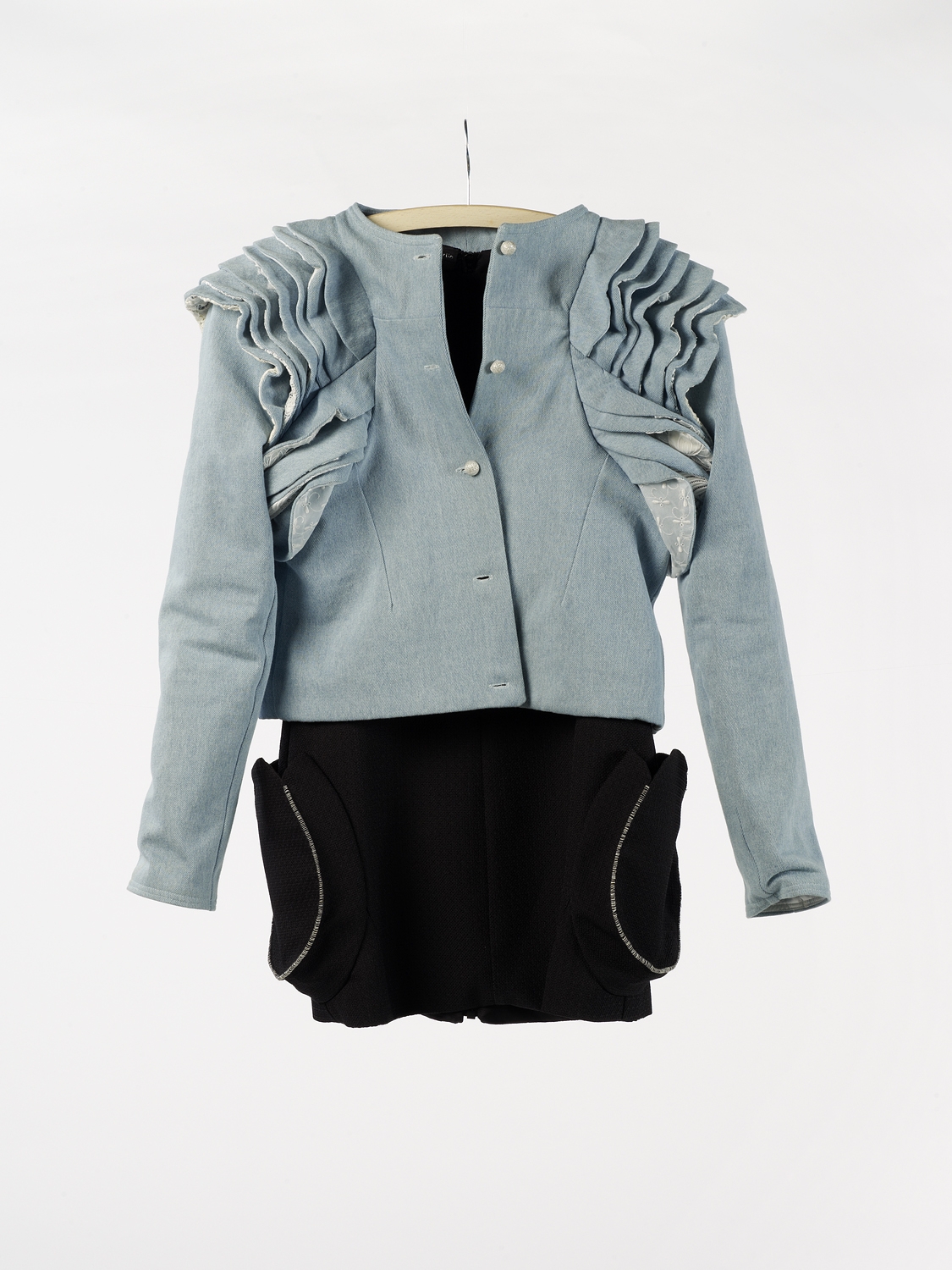 The project Antiheroes-The-Good-And-The-Evil-Women, for which Armando Forlin has won a Swiss Federal Design Award, is an extension of that graduate piece. It comprises designs for six types of women: three 'good' and three 'evil'. All of them are unconventional and contradictory – antiheroes, indeed – and all have been allocated a design and a brief description stating name, profession and location, as well as favourite music (e.g. Stockhausen or Gainsbourg) and a personal motto. Hard Work, Hard Party is the motto of DJane from Berlin, while Bianca Miller from New York has no time for mottos. In spite of the somewhat clichéd, tongue-in-cheek format, Forlin's brief descriptions show that he does put some thought into the kind of people who would wear his clothes.