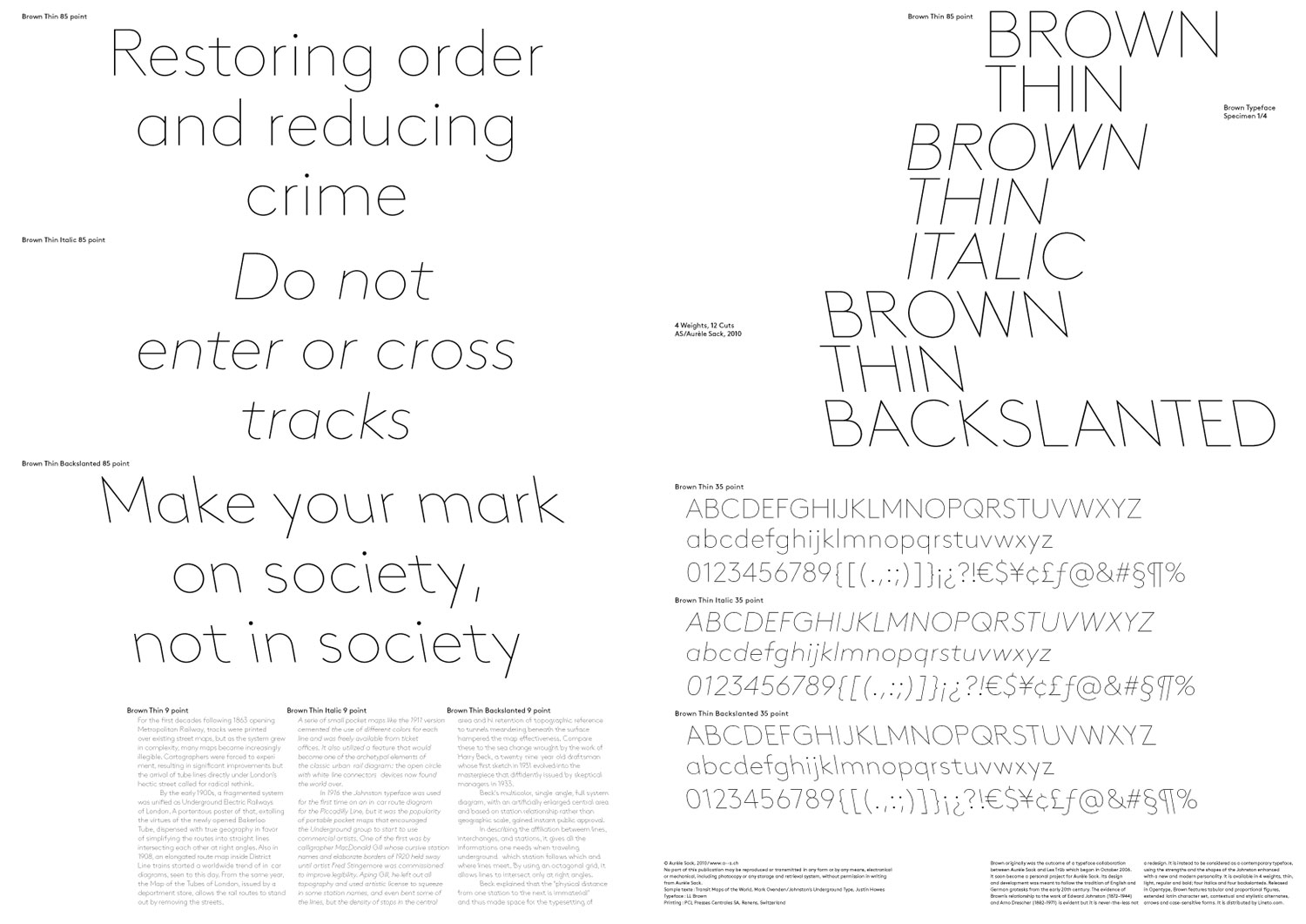 How can one follow in the footsteps of modernism and still develop a typeface that is entirely contemporary? Aurèle Sack, typeface designer and graphic artist from Lausanne, answers that question with his font family 'AS Brown', which took him four years to develop. Specialists will immediately identify Sack's model and laypeople will probably sense something familiar: Sack refers in general to the grotesk typefaces of the early 20th century, specifically to the trailblazing design of Edward Johnston (1872-1944), who was commissioned to create a typeface for the Underground Electric Railways of London in 1913. Its unembellished clarity has set standards and it superbly demonstrates the influence of corporate design on the success of the company. But in designing 'AS Brown', Sack was not interested in revamping an existing font; he wanted to develop a typeface with a 'new and modern personality'. The regular cut is slightly larger than usual, making it especially legible, which also applies to the italics, slanted at a 10° angle. The typeface is available in four weights, from ultralight to bold, and three slants, and is already being used successfully, for instance in Das Magazin, the weekend newspaper supplement, where it appears in combination with 'AS Garamond' (developed in cooperation with the designer Jonas Vögeli). ECAL by Tschumi, an attractive publication about the new ECAL Campus by architect Bernard Tschumi, is also persuasively printed in 'AS Brown Regular' and designed by Aurèle Sack. Incidentally, Sack has close ties to the Ecole cantonale d'art de Lausanne (ECAL). He graduated in Visual Communication in 2004 and now teaches courses there in typography and book design. His precision and perseverance are as impressive as his objective of developing a contemporary and versatile typeface that follows in the footsteps of modernism.