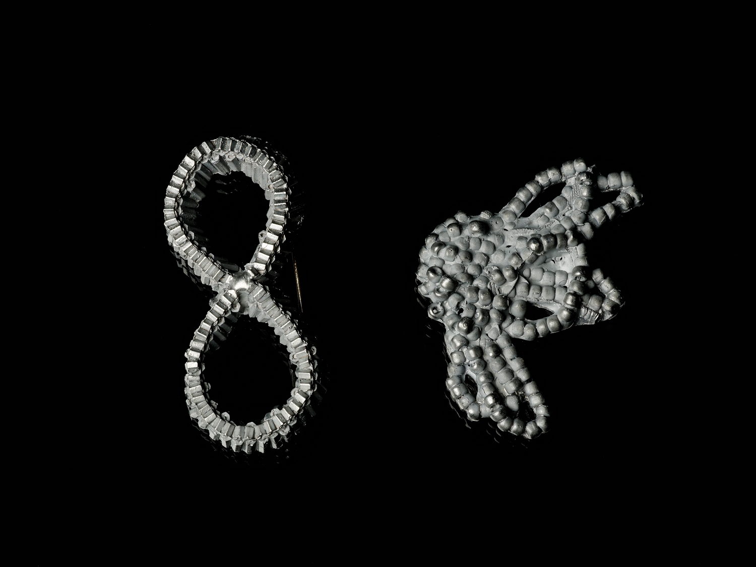 How can jewellery express 'eternal' themes like transience, personal relationships and family clans? Monika Strasser trained as a goldsmith in Zürich. While in New York in 2008, she combed the garment district for appliqués. She found glass beads, sequins and rhinestones. These she cut up and reassembled without using any conventional goldsmithing tools. She then made wax negatives and cast the pieces. Through this process the cheap source material was transformed into something permanent and valuable. She called the outcome – eight mysterious black objects – Bridal Flowers. Back in Switzerland, Strasser returned to traditional goldsmithing techniques to create counterparts or companion pieces to the objects made in New York. Her brooches and necklaces make ostensibly archaic shapes look gracefully elegant. Made of white gold or silver and sometimes blackened, they form pairs with the original object and are eloquently titled Garten Eden, Dark Side of the Honeymoon and Bis dass der Tod uns scheidet (Till Death Do Us Part). At first sight, the works look lighthearted and playful, offering seductive surfaces, but on close inspection they may well take a different turn: for instance on discovering that the cutouts in one of her objects are the hollow eyes and mouth of a skull. Transience is a crucial concern for Monika Strasser.