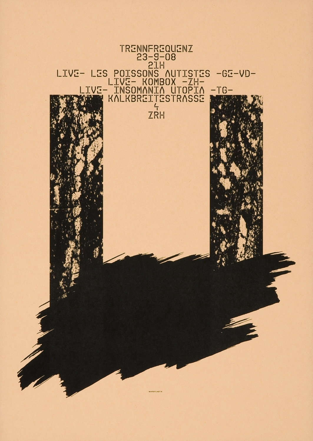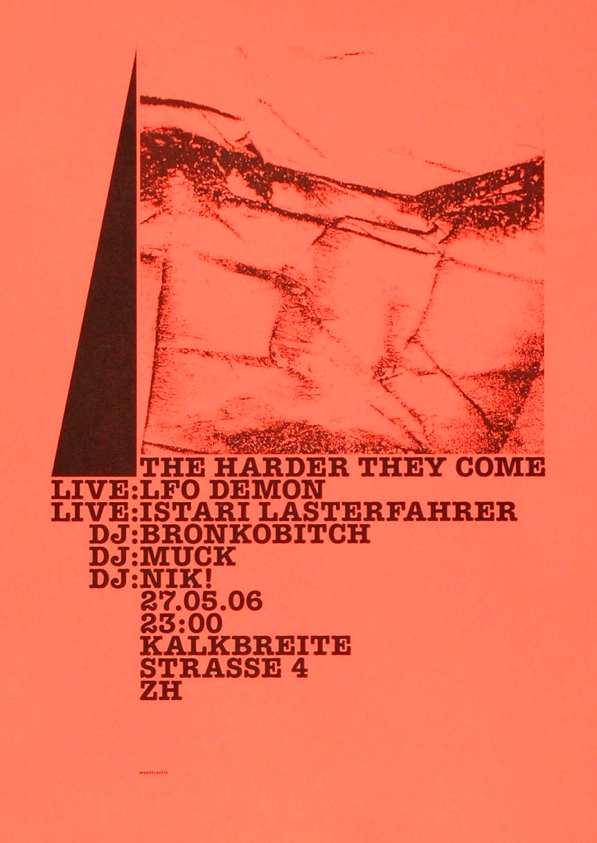 What makes a designer decide to print in only one colour? The Zürich graphic designer Lukas Zimmermann, who graduated in visual communication at the Zürich University of the Fine Arts, explains: he starts by looking for common ground on which to base typeface, image and drawing. Since 2003 he has consistently printed his posters in only one colour. He skilfully cultivates manual craftsmanship, as clearly shown in the lettering, the application of the ink and the line drawings. Most of his posters advertise musical or cultural events and he prints them himself in editions between 30 and 300. Rarely does one come across such a stringently designed oeuvre, articulated in several printing techniques including digital, silkscreen and cardboard prints. In addition to his virtuoso mastery of lettering, Zimmermann 'finds' suitable imagery and consistently translates one powerful idea into a single image per poster. A roaring lion announces a DJ evening at an underground Zürich club – a striking and singular statement, capable of calling attention to itself in the raucous market of music flyers. For the announcement of 'Evil Rave', he used provocative line drawings of a set of knives from a paring knife to a large butcher's knife. His letters often look as if they had been cut out by hand and radiate a crude charm. Zimmermann's flyers communicate an underground feel and reassuringly pit themselves against omnipresent high-gloss graphics. He also – unsurprisingly – designs flyers for the Rote Fabrik in Zürich. His treatment of lettering is especially creative; he distorts it, blows it up and often makes it look as if it had been stamped on the paper. Zimmermann's courage to step out of line and wilfully espouse a handmade look is a vital and welcome contrast to the relentlessly smooth, stylish world around us.