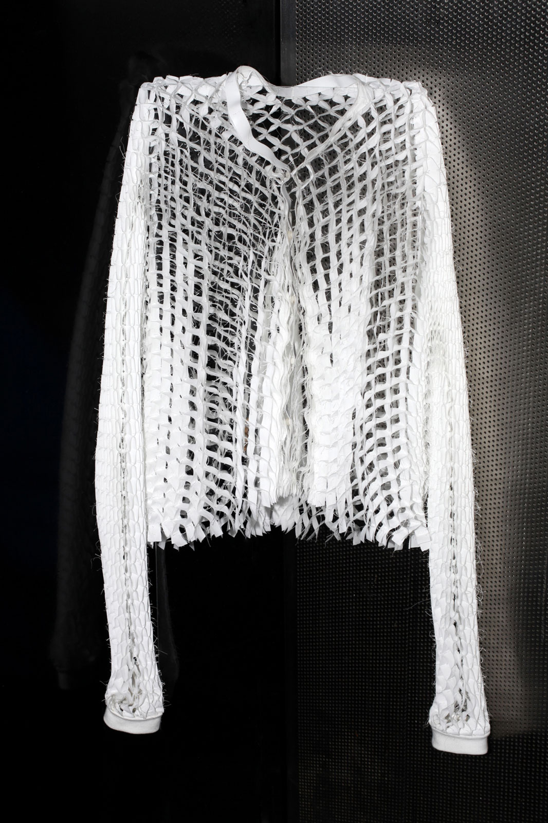 In order to create his new, untitled collection, Knecht learned to weave, to bring the yarn together in a unique way through warp and west to create a material surface. The design process involves an interaction between the designer, a cut of the clothing and the female body itself. Knecht begins by weaving the garment on the body in order to decide where points of contact should ideally be placed. Where the fabric hugs the body, constraint is created; where it is loose, the body can move freely.