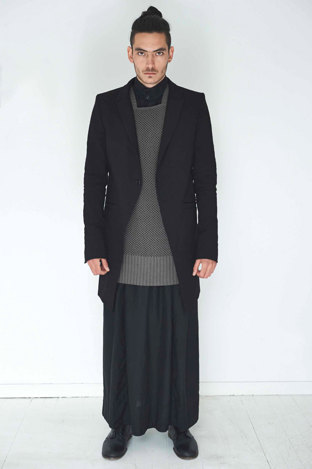 The collection submitted features strikingly clear cuts and the use of traditional materials, making for a novel visual and tactile experience in men’s fashion. Sandro Marzo uses a combination of natural materials including fine leather, coarse piqué, felt, linen, wool, cashmere, porcelain and horn. The language of form and material is redolent of the rough, barren, rural south Italian landscape where Marzo’s family has its roots. He employs clear, standardised cuts that draw inspiration from liturgical vestments, monks’ habits, priests’ robes and military uniforms. Equally clear is the collection’s palette, in which muted colours such as grey, white, black, beige and dark green predominate.