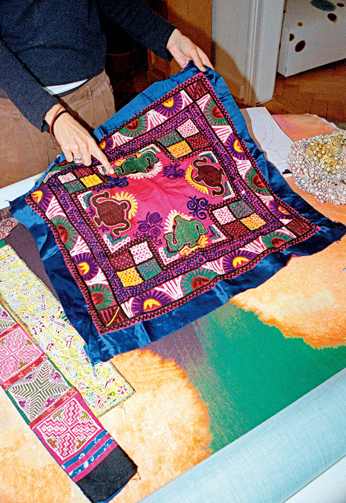 A look at two of Caviezel’s projects gives revealing insight into her work. For her 5 x 8 metre wall covering on view at the Westbund Art and Design Fair 2014 in Shanghai, she applied untold washes of paint with squeegee and scraper to old plastic sheeting on which her projects had been printed. Occasionally the former prints could be seen shining through. “I scanned and enlarged the combinations of colour that I liked best, then modified and reassembled them,” Caviezel explains. She placed a vibrant array of flowers and animals against this colourful background. Many of the motifs come from her extensive collection of photographs and sketches, produced in the course of her travels. The opulent wall piece was an eye-catching favourite among visitors to the Westbund Art and Design Fair. Innumerable Chinese visitors had pictures taken of themselves standing in front of it. Caviezel’s contribution in Shanghai did not escape the notice of people in Switzerland and, in fact, internationally, with reproductions of the work appearing in publications all over the world. This has led to commissions for new wall pieces and interior design projects both at home and abroad.