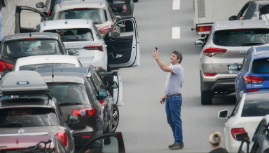 Dogs walking on the breakdown lane, bachelorettes partying in the car and a bored child looking for something to do. Thousands of impatient travelers are trapped in the traffic jam of the century. Ahead lies the Gotthard mountain and one of the longest tunnels in the world, the gateway to the sunny South. Glued to the asphalt, climate activists are heating up the mood even more. Who will snap first?