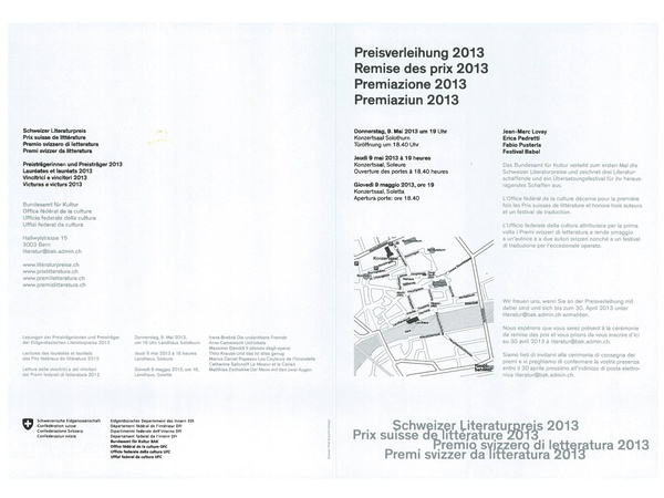 The Federal Office of Culture awarded the Swiss Literature Prizes for the second time, honoring three literary creators and a translation festival for their outstanding work. The award ceremony took place at the Solothurn Concert Hall in the presence of Federal Councillor Alain Berset.