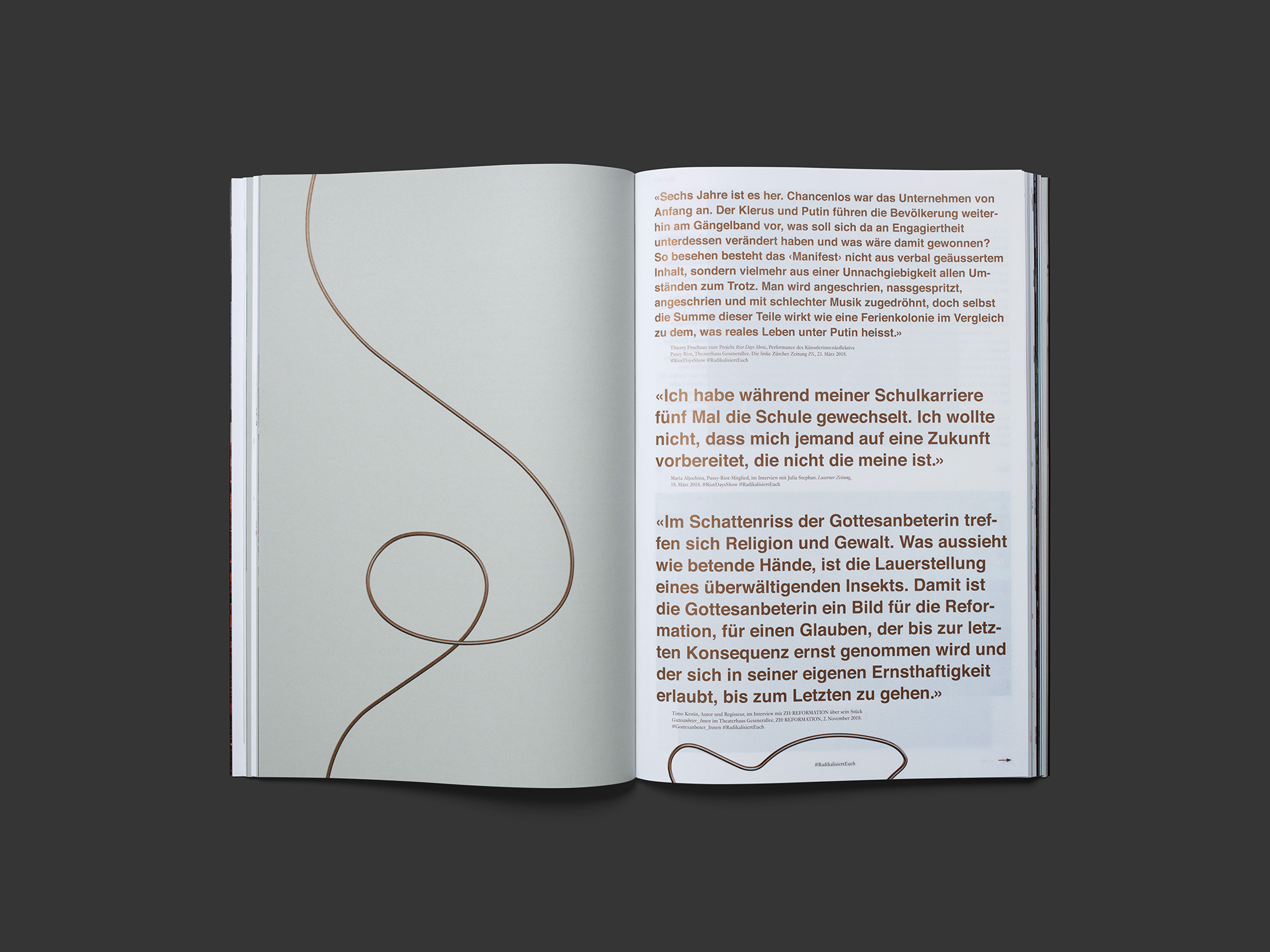 The design of this medium-format brochure on Zurich’s Reformation commemorations deploys a dazzling variety of unconventional stylistic resources that reflect the diversity of the 18-month event series and subvert the aesthetic dichotomy of ‘beautiful’ and ‘ugly’. While the pictorial and textual documentation on the individual events is presented in a uniform two-column layout, it is interspersed with essay sections (on grey paper), full-bleed photo series (featuring subjects such as church interiors) and various graphic representations of the events and the history of the Reformed Church in Zurich. The use of two colours – black and copper – for the cover, texts, graphics and some of the photos lends a degree of continuity. A recurring ornament suggestive of a copper wire runs like the proverbial thread through the book. The various collage and rendering techniques employed for the graphic elements are especially striking. The black-and-copper cover with its singular ornament is among the best of the year.