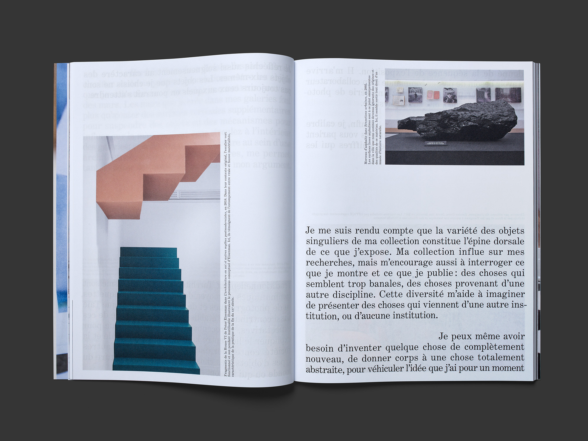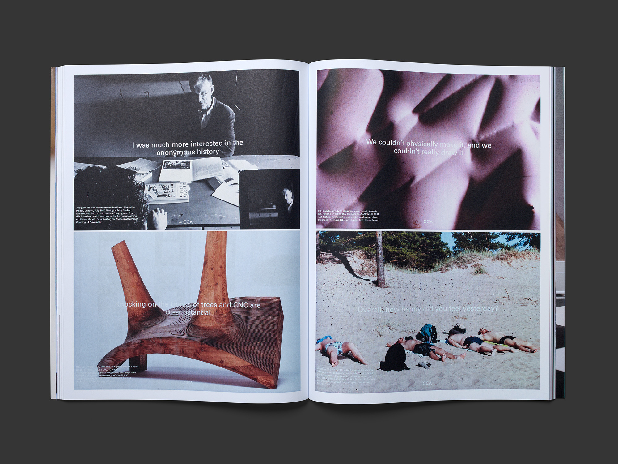In this programmatic publication from the Canadian Centre for Architecture (CCA), which takes an entertainingly critical look at the role of the museum institution, the skilful and exquisitely crafted design assumes a leading function. A text divided into nine chapters, which runs through the book and in which the CCA speaks in the first person, is laid out in a single column in a large typeface, punctuated by individual images with detailed captions and generous areas of white. In between are numerous illustrated texts and interviews with some 30 curators from the international museum scene, presented in a small typeface and three-column grid. Overall, the design ensures that the theoretical explanations come across not as arrogant but rather as accessible and even human. This is a genuinely novel way of serving up information that is very open, fluent and generous. The result is a fantastic reading experience enabled by a designer who has mastered every aspect of his craft and presents the material in the best possible way.