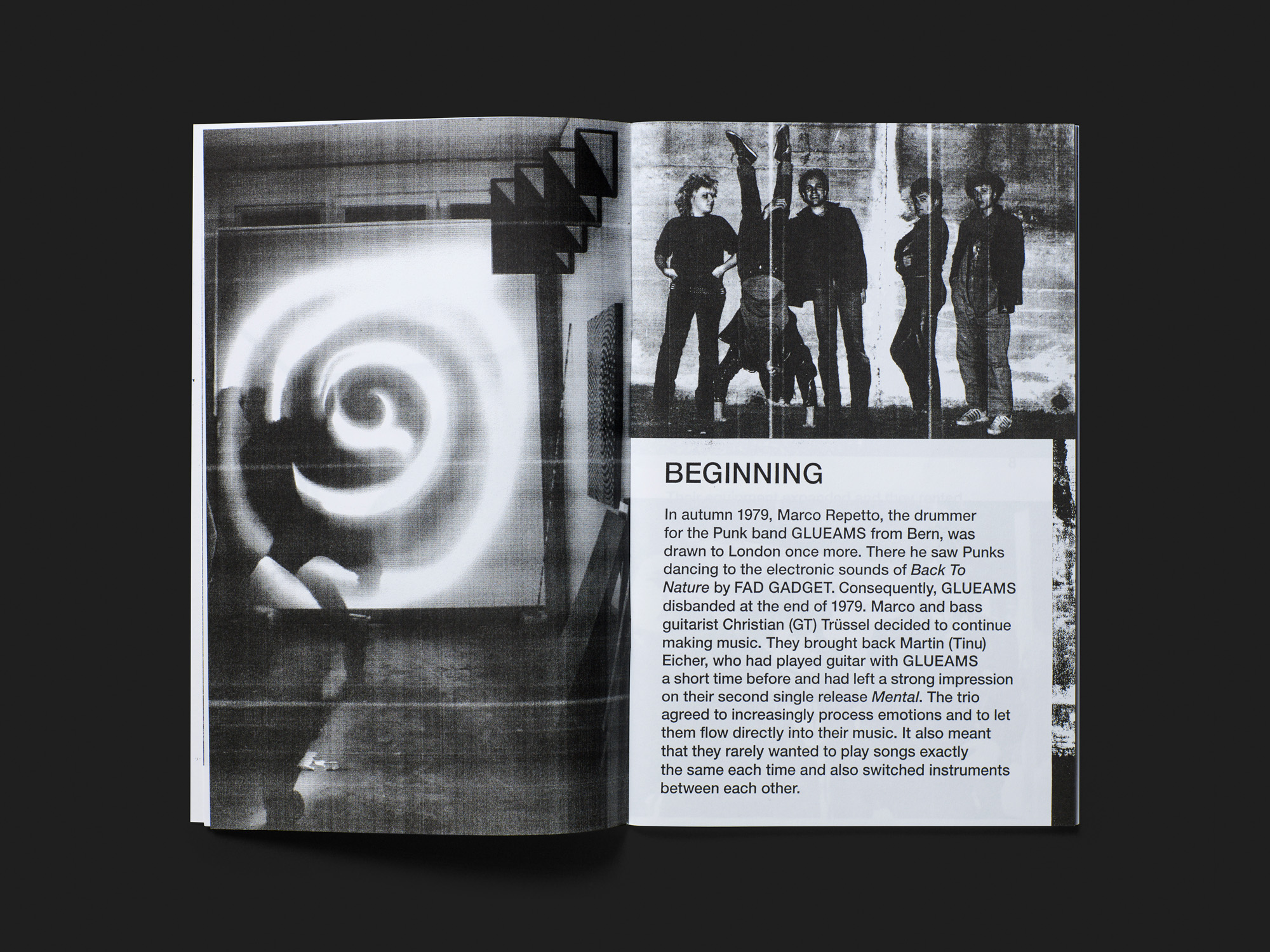 A completely black-and-white volume in a slender portrait format turns out to be an unpretentious autobiography of the 1980s Swiss band Grauzone, containing a substantial body of material in condensed form. From outside it looks like a hastily assembled fanzine, but inside it tells a thoroughly researched and even authoritative story in a strikingly straightforward manner. A multipart essay reconstructing the band’s short-lived yet legendary exploits with a wealth of detail runs in a relatively large font through the book. Each double page additionally features between one and five historical sources: concert photos, drawings for album covers, posters, reviews, letters and more. All are reproduced in high contrast in the manner of a photocopy, while a dozen works by visual artists from the band’s entourage are presented between them in the same way. The obvious resort to the media practice and aesthetic of punk is not mere mimicry, but an appropriation grounded in the subject matter: the publication is about the 1980s, and looks like it too.