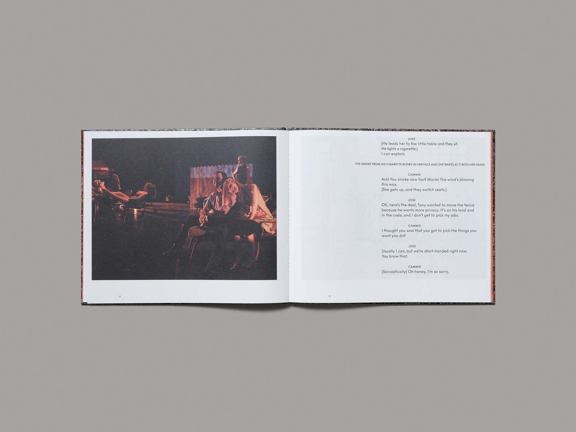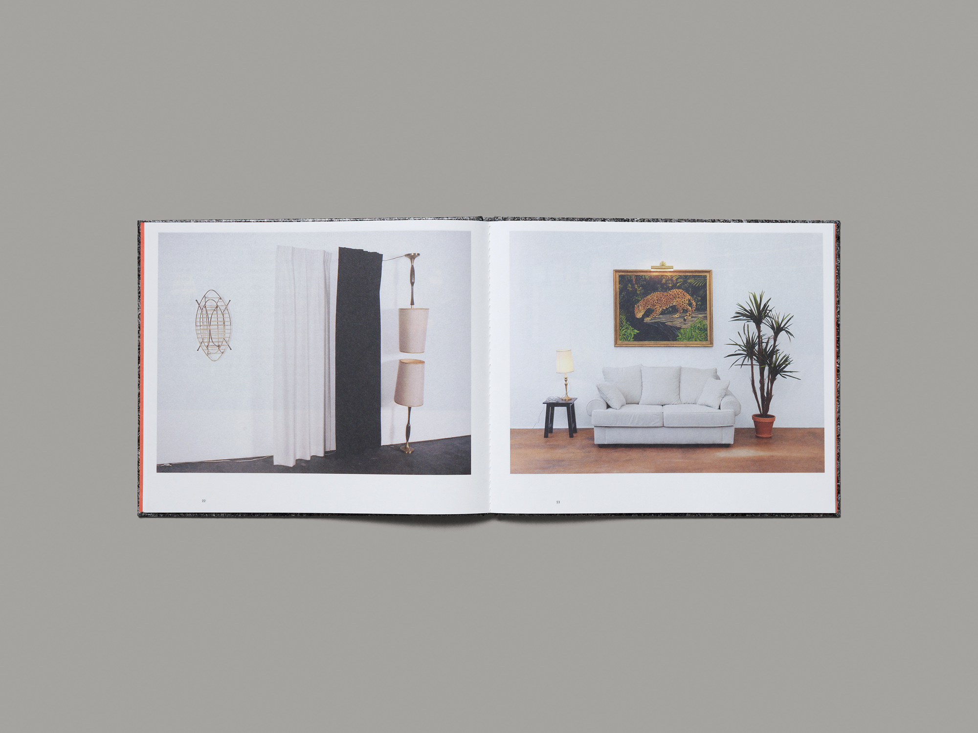 This slim landscape-format art catalogue on William Leavitt makes a startling impression with its cover, which is very hard and unpleasantly rough but chimes perfectly with the conceptual approach of the artworks documented. The unconventional material is reminiscent of some of the artificial building materials that Leavitt uses in his spatial imitations of Californian interiors. Inside, two dozen of these fake interiors are presented in extremely sober fashion – always a single landscape photograph with a regular white border on a page. Some illustrations of theatrical works and videos, which Leavitt on occasion staged in his interiors, are given exactly the same treatment, only here short sections of text are added to the facing page. The cinematographic style of presentation pays homage to Leavitt’s explorations of aesthetics and narrative patterns in Hollywood films. The volume’s cohesive design combines five decades of work to retrospectively create what is seemingly a continuous film script. The slightly translucent paper makes reference to the many installations and threshold situations within the interiors.