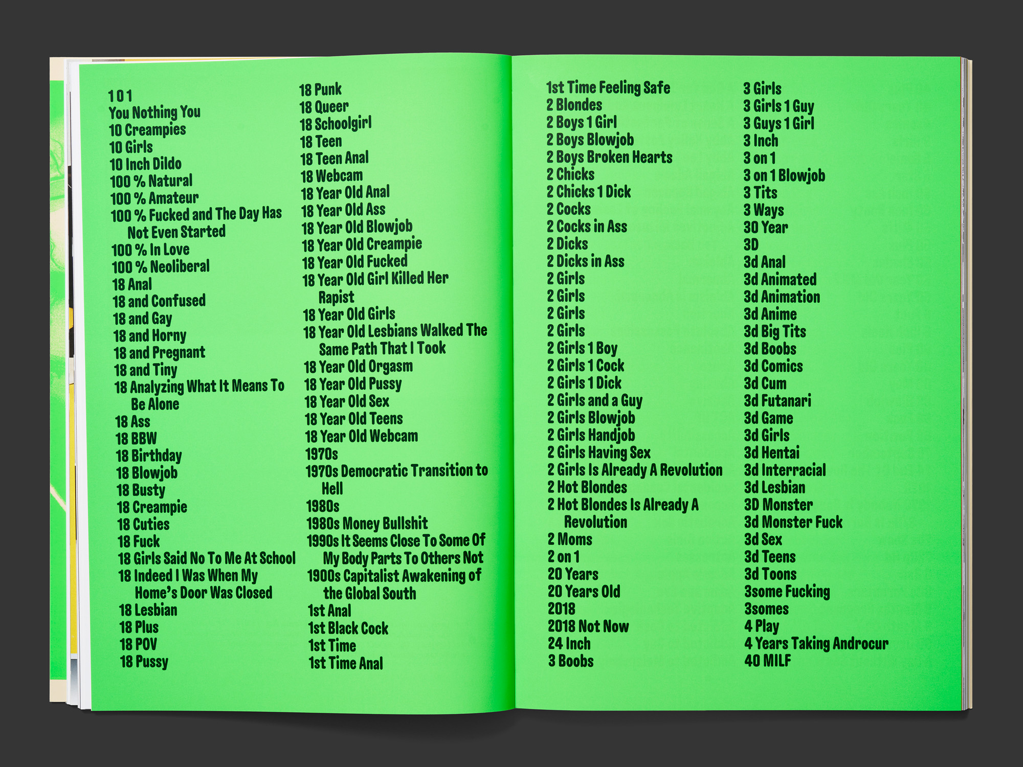 This hefty and flexible monograph by the dancer and choreographer Alexandra Bachzetsis largely uses existing pictorial material, but then creates something new from the ways in which it is combined. Each individual work is represented by a series of images from different sources – press material, advertising material, portraits, documentation, and so on. These sections of recycled images alternate with new essays in a uniform black-and-white layout. There are also three visual essays and two sections of poetry, which are printed in special fonts on highgloss colour paper. The various elements come together to form an eclectic show, in the same way that Bachzetsis often works with changes of scenery, costume and lighting in individual works. Everything is brimming with energy and vitality. The vinyl dust jacket printed in neon green combines with the cardboard cover to deliver a foretaste of the contrasts within. There is a great deal to see, but the book never becomes cluttered or mannered.