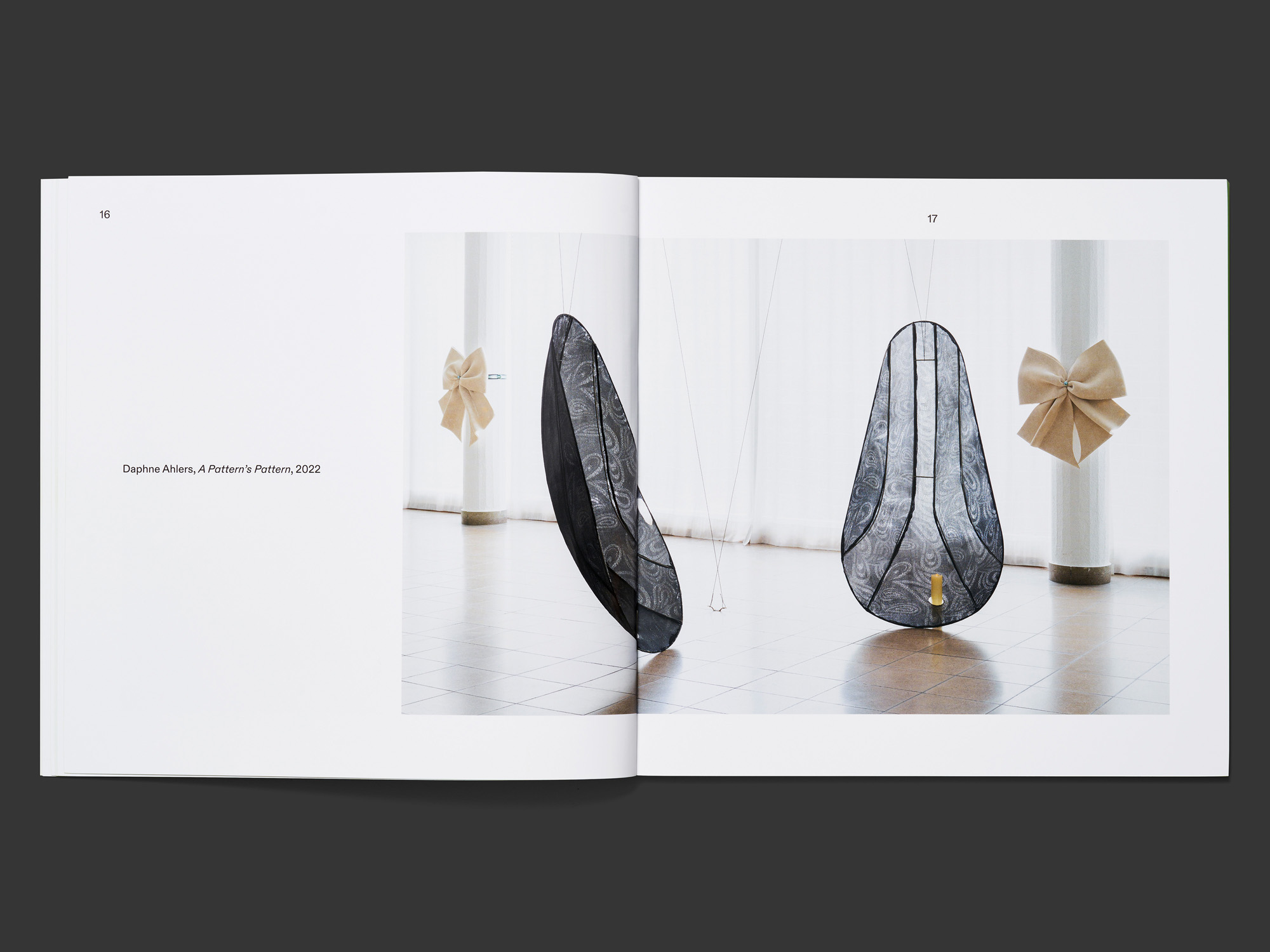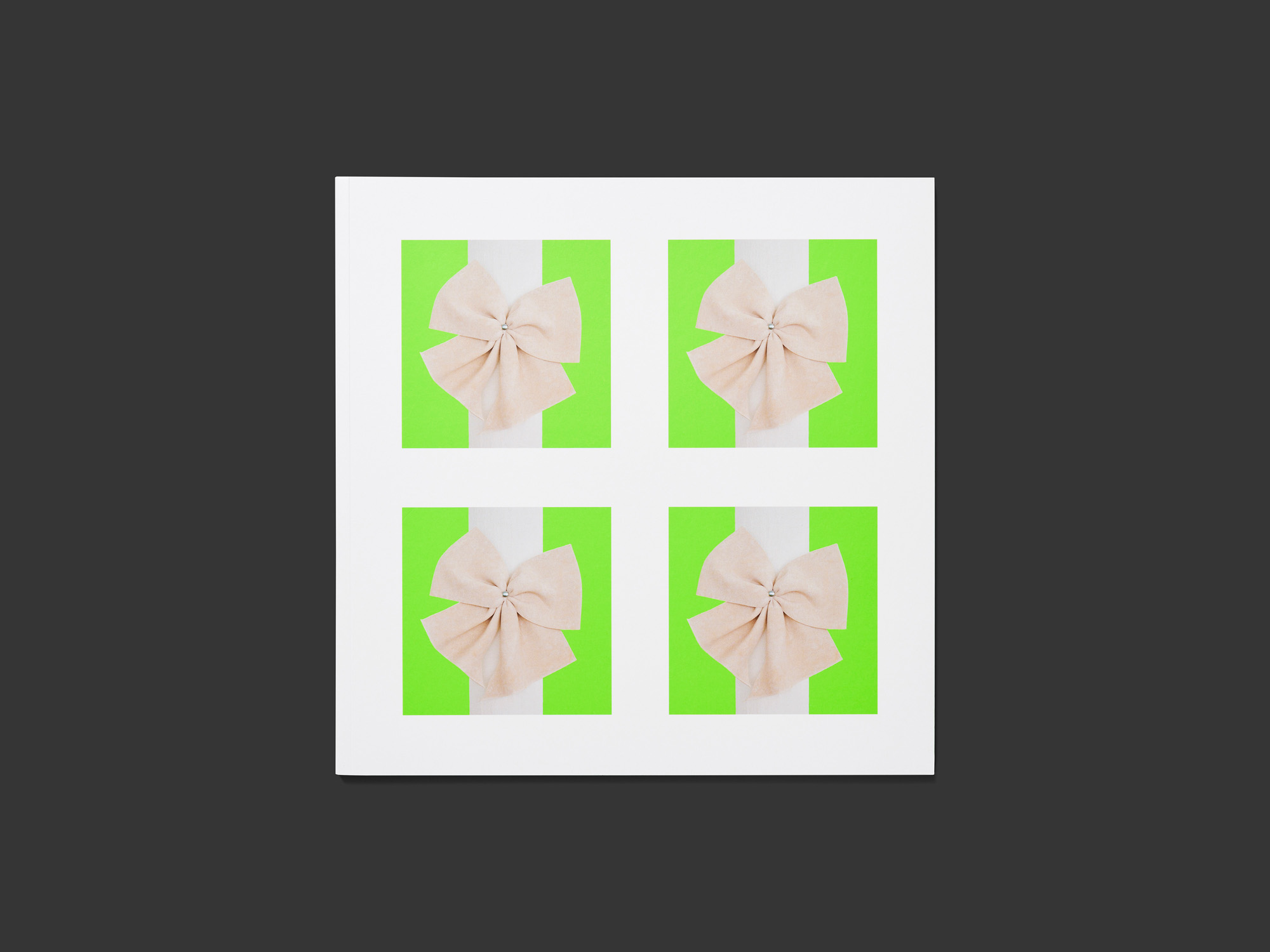 This slender square catalogue of works by the Hamburg artist Daphne Ahlers features sculptures of various different kinds, gracefully arranged so as to pose questions about the artistic presentation of objects and the value that is placed upon them. It makes a mysterious first impression: the white book block bears four identical images of a white ribbon tied in a bow against a green background, as well as two green edges, calling to mind a gift-wrapped present. A number of exhibition views, each displayed singly on a double page with a broad white border, show Ahlers’s fragile fabric sculptures. Following an essay laid out in a wide column in a sans-serif typeface, a series of smaller wall-mounted objects are presented individually in uniform photographs as if they were pieces of jewellery. Two simple image layouts are repeated in a rhythmical pattern, while the page numbers are constantly placed in different locations, making for an interesting typographical detail. In contrast to the luxurious presentation, the relatively stiff paper and cardboard cover bring more of the feel of a low-budget production. From a distance, the catalogue is reminiscent of art publications of the 1970s but with a new, contemporary form.