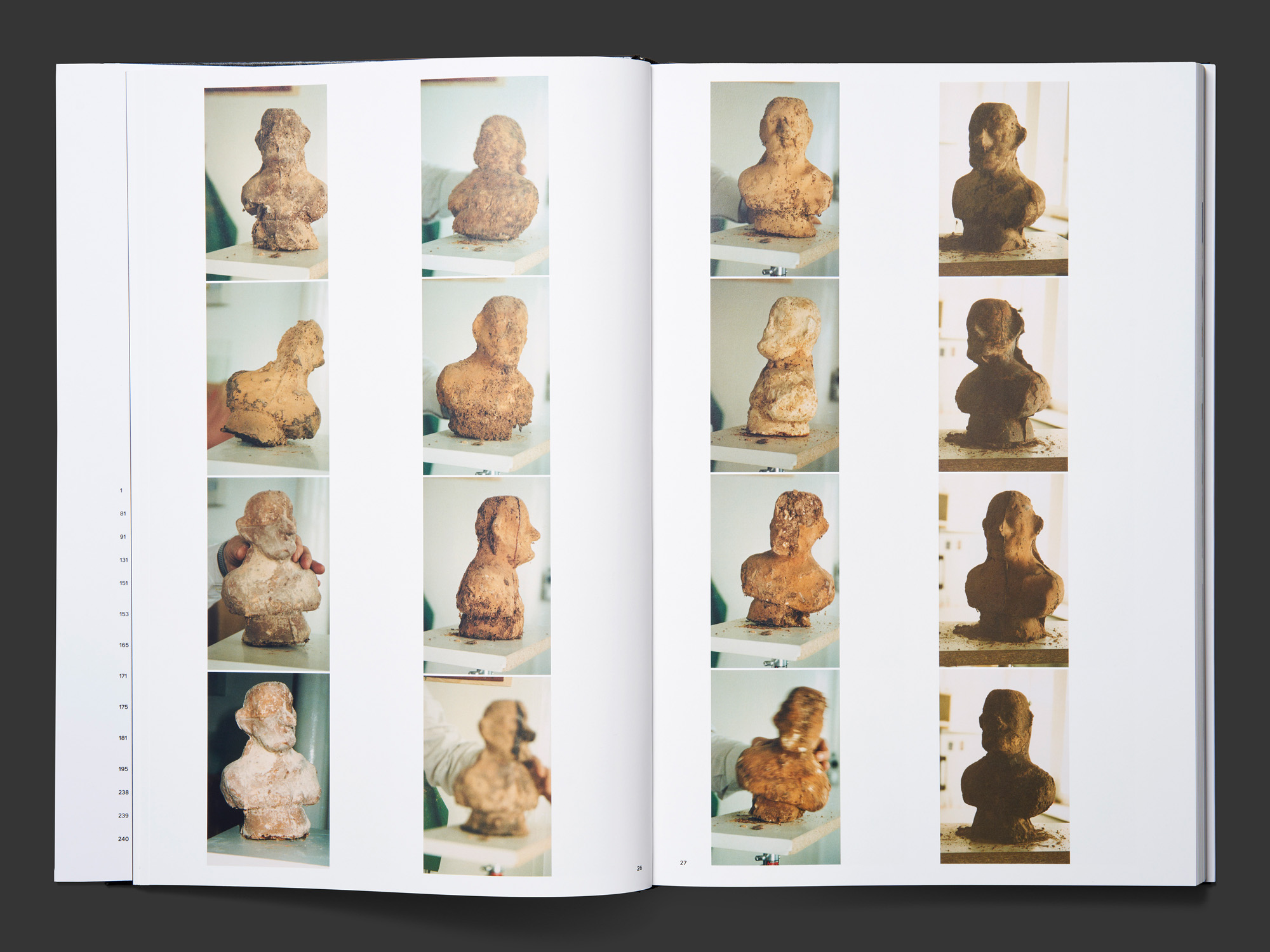 Well over a thousand small photos and video stills in an oversized yet narrow portrait format document the obsessive approach and unprettified aesthetic of Dieter Roth, without coming across as a book by Roth. The images provide an exhaustive record of a former studio of Roth’s in Basel that was sold in its entirety. In this space, Roth sporadically worked on two series of small sculptures – the ’Selves’ and the ’Lions’ – which he cast out of chocolate and sugar and then stored on two tower-like shelves. From Roth’s death in 1998, the slowly disintegrating sculptures were open to the public, until a technical fault with the air conditioning in 2007 made a (paradoxical) restoration necessary. This monumental book presents Roth’s repetitive life-size photos of the sculptures in two columns per page; the smaller video stills are laid out in three columns. The reproduction of the material is very direct, and the essay section includes facsimiles of Roth’s written terms of sale and use for the studio. Despite the rigid structure, there are occasional irregularities and pauses in the page layout, and the cinematographic presentation skilfully foregrounds the element of time that lies at the heart of the work.