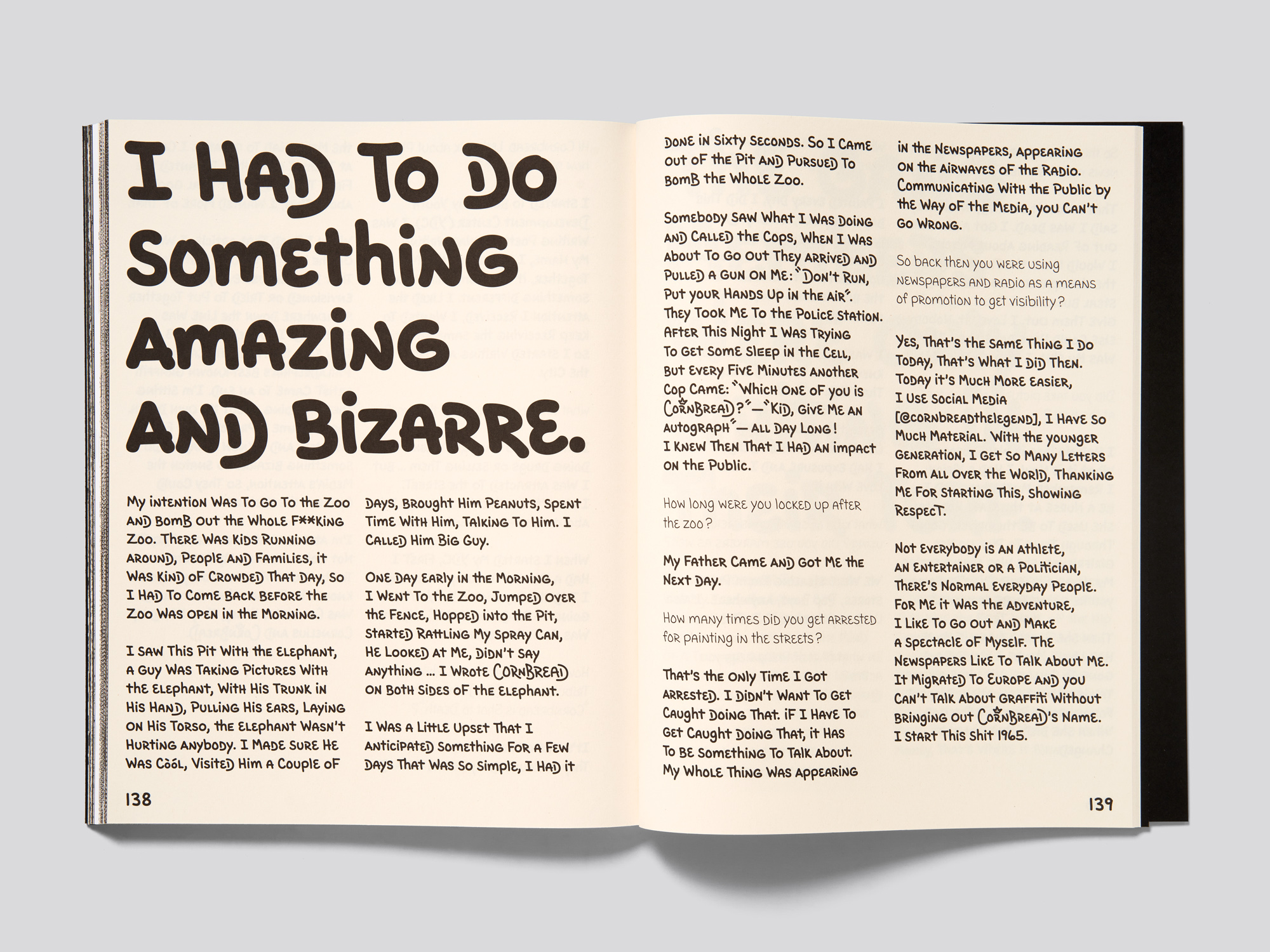 This mostly black-and-white specimen book for a new typeface created by a US graffiti pioneer tempts the reader with illuminating background information, going back in time from the digital age to the 1960s. It starts with a long sequence of images of photocopied – and sometimes enlarged – newspaper cuttings that reconstruct the public perception of the Philadelphia graffiti artist at that time. He was one of the first to turn the repeated spraying of a tag throughout a city into a form of artistic expression in public space, and, as a mysterious local celebrity, he was once falsely declared dead by the newspapers. The gripping visual story does not suggest a type specimen book, which is why the many subsequent white pages filled with large black letters and words in a single weight of the typeface initially come as a surprise. But it makes total sense to expand the specimen book in this way, especially when the typeface was so closely tied to the biographical and local context. This is then underscored by a second picture section with full-bleed historical photos of spray-painted graffiti and occasional portraits, mostly coarsely rasterised, and an illustrated conversation between the editors and the artist. Although this kind of photocopied aesthetic is not always easy to manage, here it is expertly handled and quite natural. The thick cardboard cover with unfinished edges gives the book a strong object-like feel – almost like a piece of wall. The cover featuring a historical newspaper report on graffiti removal overprinted with the book’s title in red suggests that the artist has prevailed in the face of all resistance. Overall, the publication contributes to raising awareness of the cultural, historical and political background of a graffiti-inspired typeface that, for a younger audience in today’s world of myriad digital fonts, might seem out of time and place.