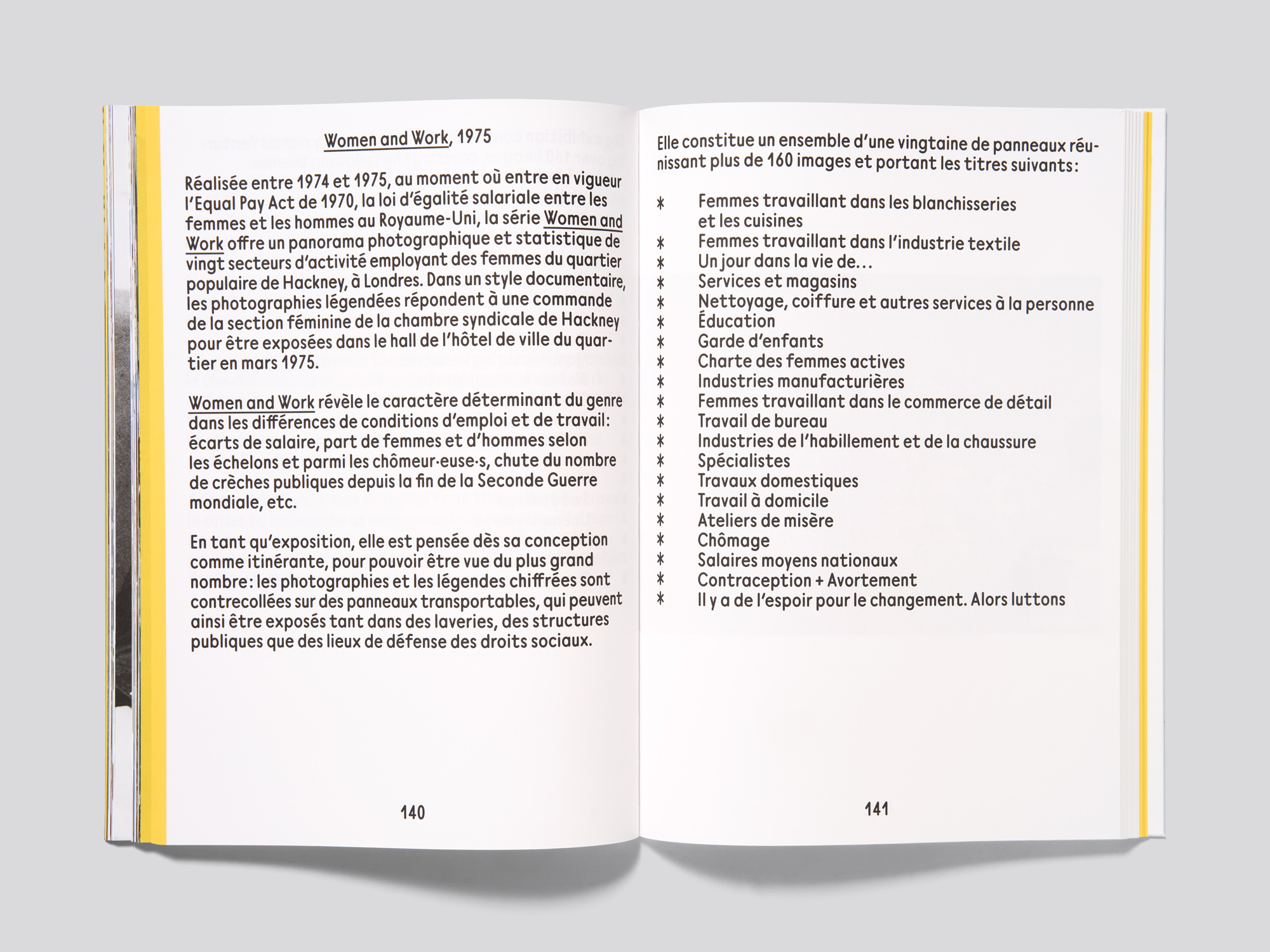 The design of this medium-format hardcover book in black, white and yellow emphasises the continuing relevance of its subject: the feminist movement of the 1970s. The volume explores the London-based female collective the Hackney Flashers, whose two touring exhibitions (1975 and 1978) and slideshow (1980) brilliantly combined images and text to denounce the exploitation of women as sole child-rearers and underpaid workers. The activists also organised demonstrations and initiatives around childcare. The fact that these concerns are as relevant now as they were then is highlighted by the radical design, which shuns nostalgia and transposes the historical sources to the present. For instance, the full-bleed title photograph of a child at a demonstration, holding a placard bearing the slogan ‘PARENTS MUST UNITE + FIGHT’, now functions as the book title. A ‘cinematic’ 64-page prelude presents the exhibition materials produced by the Hackney Flashers on corresponding image and text pages without commentary, as if it were a current work. The noise of the streets is made visual and speaks directly to the viewer. It is not until the second part of the book that the historical background is addressed, in an academic essay on yellow paper. The book concludes with a plate section containing exhibition panels and with brief biographies of the protagonists, including a recent group photo. The strategic fusion of past and present also extends to the typography, as the simple, monolinear and rounded typeface used for all the texts harks back to the ‘écriture script’ handwriting that has been taught in French schools since 1945. All the elements work harmoniously together, and the jury did not question a single decision made by the design duo.