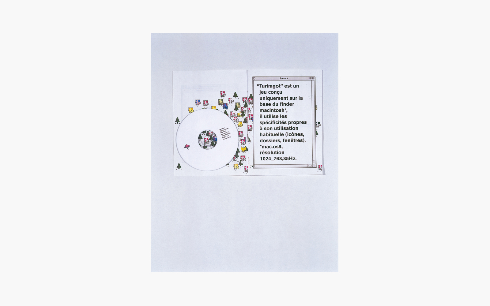 Le designer multimédia Nicolas Party présente, avec 'Turimgot', un jeu pour ordinateur qui se base sur Mac Finder, et qui utilise la structure d'ordre et le langage informatique propre au système d'exploitation. Dans une première fenêtre de dialogue, on bénéficie d'une introduction, d'une explication et d'un 'sac à information'. Les joueuses et les joueurs sont invités à sauver le monde de Turimgot, victime de catastrophes et de soulèvements, à l'aide d'informations collectées dans sept pays différents, et d'énigmes à résoudre. Sans grands effets visuels, mais avec un graphisme discret, délicat et très économe, Nicolas Party construit les paysages ludiques à parcourir. C'est un jeu dont la structure complexe est attractive surtout pour une communauté de joueurs invétérés. En comparaison avec les jeux électroniques traditionnels, 'Turimgot' fixe un tempo inhabituellement lent, ce qui consonne parfaitement avec le langage poétique du texte et des images.