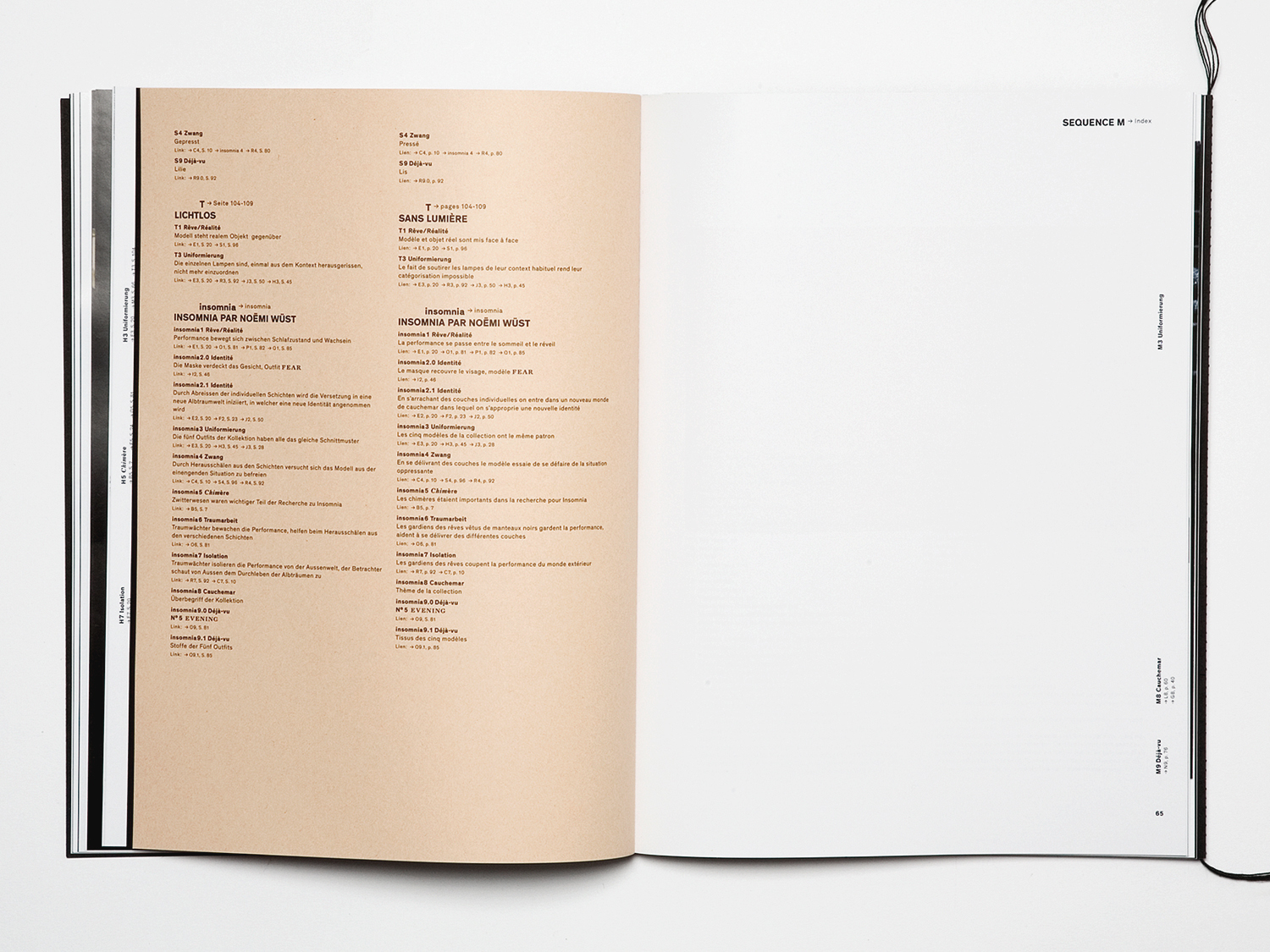 Les deux graphistes Noémie Arrigo et Corina Neuenschwander ont réalisé, pour leur travail de diplôme à la Hochschule für Gestaltung und Kunst de Zurich, un magazine qui, s'inspirant de la collection d'une designer de mode, associe divers domaines de manière interdisciplinaire – à savoir le graphisme, la photographie et la mode. Le magazine, '2e PEAU, inspiré par Noëmi Wüst insomnia' comporte deux parties et renvoie, dès son titre, à la collection de Noëmi Wüst, qui tourne autour du thème des cauchemars. Les deux parties du magazine sont reliées par une jaquette noire et peuvent être détachées grâce à une perforation. Pour le lookbook, les deux graphistes mettent en scène cinq pièces de vêtements d'une manière nouvelle et personnelle. La personne qui les regarde est conduite au travers d'autant de mondes cauchemardesques et s'approche ainsi pas à pas de la collection. Le vêtement comme seconde peau, serré, étouffant: un mauvais rêve?