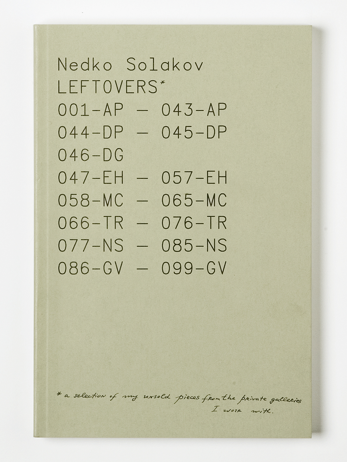 Pour le Concours fédéral de design, ils ont présenté neuf livres, fruits des commandes de divers musées d'art et éditeurs suisses. Parmi ceux-ci, un ouvrage inhabituel, 'Nedko Solakov. Leftovers'. Il s'agit du catalogue de l'exposition du même nom, que le Kunsthaus de Zurich a consacrée à l'artiste Nedko Solakov. Cette publication fait l'inventaire de ses travaux invendus – ses 'leftovers', précisément. Ils sont classés par galeries: on indique qui conserve quelles œuvres, et quel est leur prix de vente. La publication devient un guide d'achat pour l'exposition, tout en interrogeant ironiquement le marché de l'art. Les graphistes ont réussi, avec l'artiste lui-même, à trouver la traduction adéquate de la démarche artistique de ce dernier.